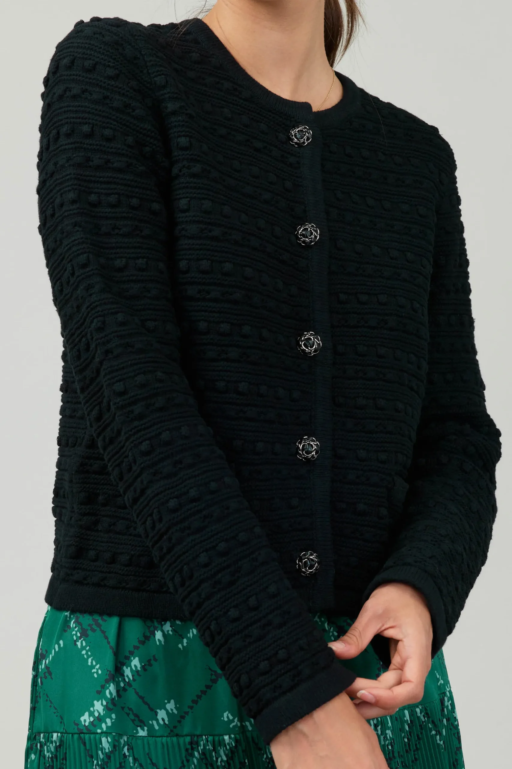 Time to get your closet ready for cooler temps. Our suggestion? This lightweight cardigan featuring button closures, and zigzag pointelle stitching that’s highlighted at the front by a bit of contrast dotting.