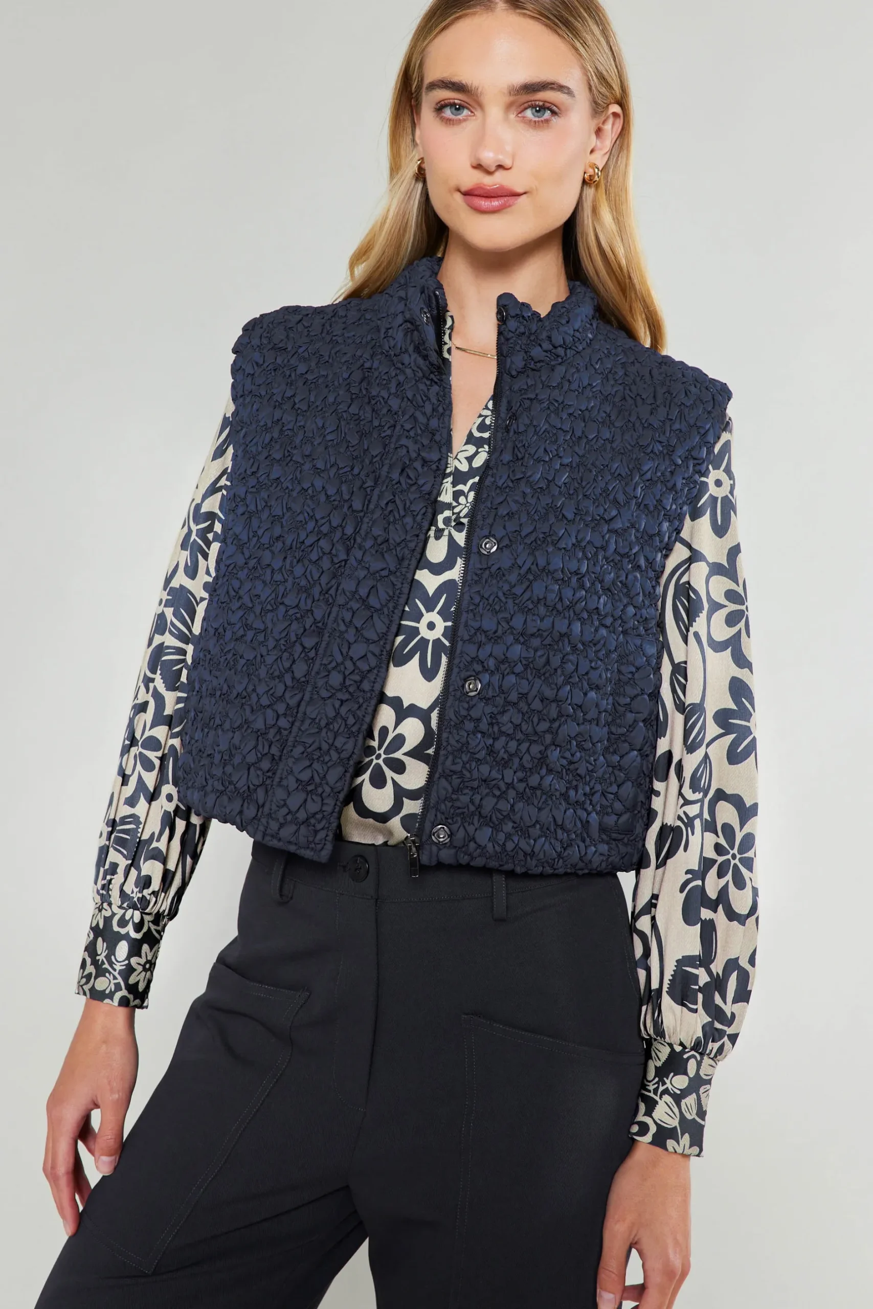 Keep this vest at hand for the shift into cooler temps. Cropped and quilted, it’s an easy way to bring extra warmth to your outfits.