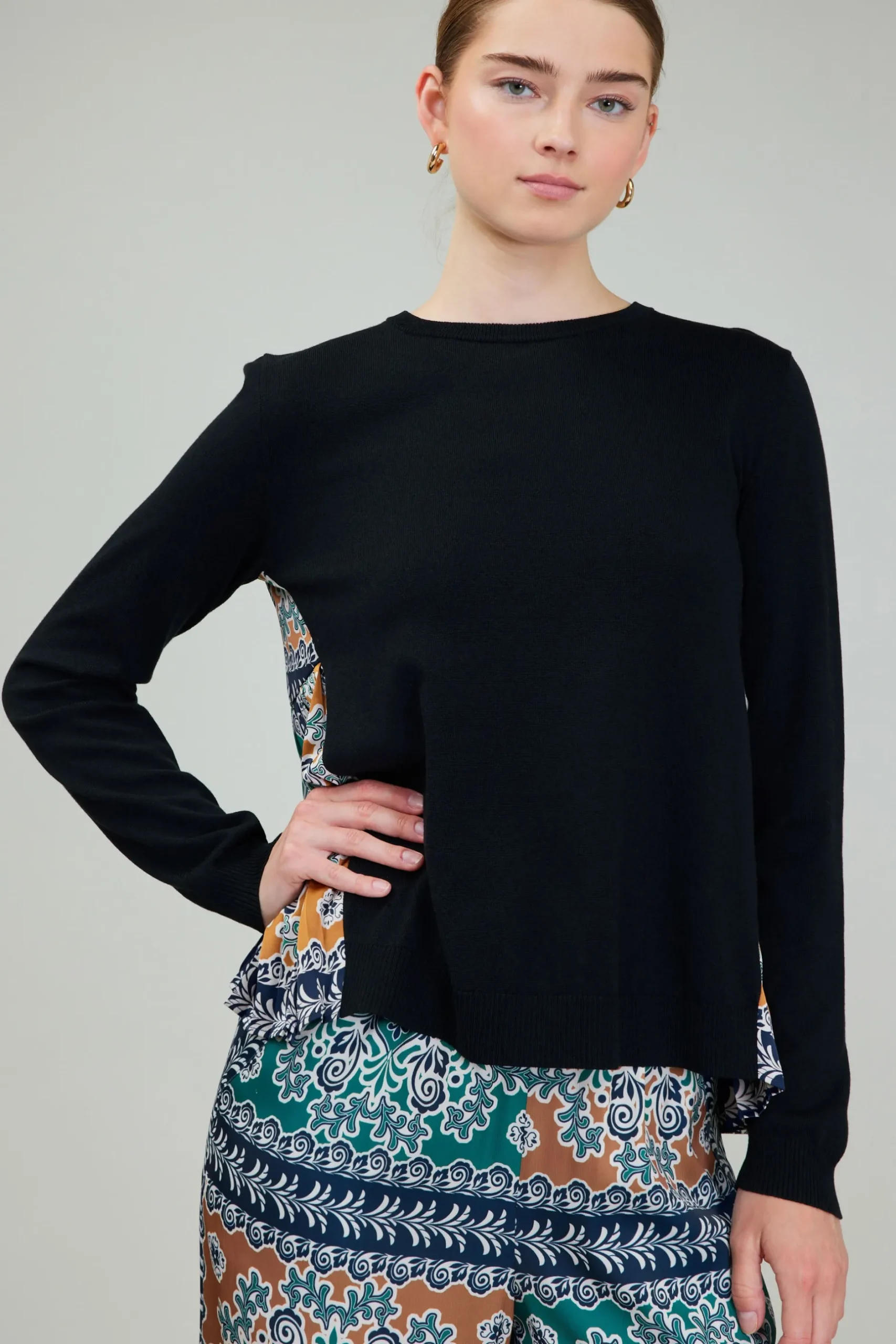 This crewneck sweater makes a statement with its distinctive woven back. It’s got an ornate print and sharp pleating, ensuring it stands out.