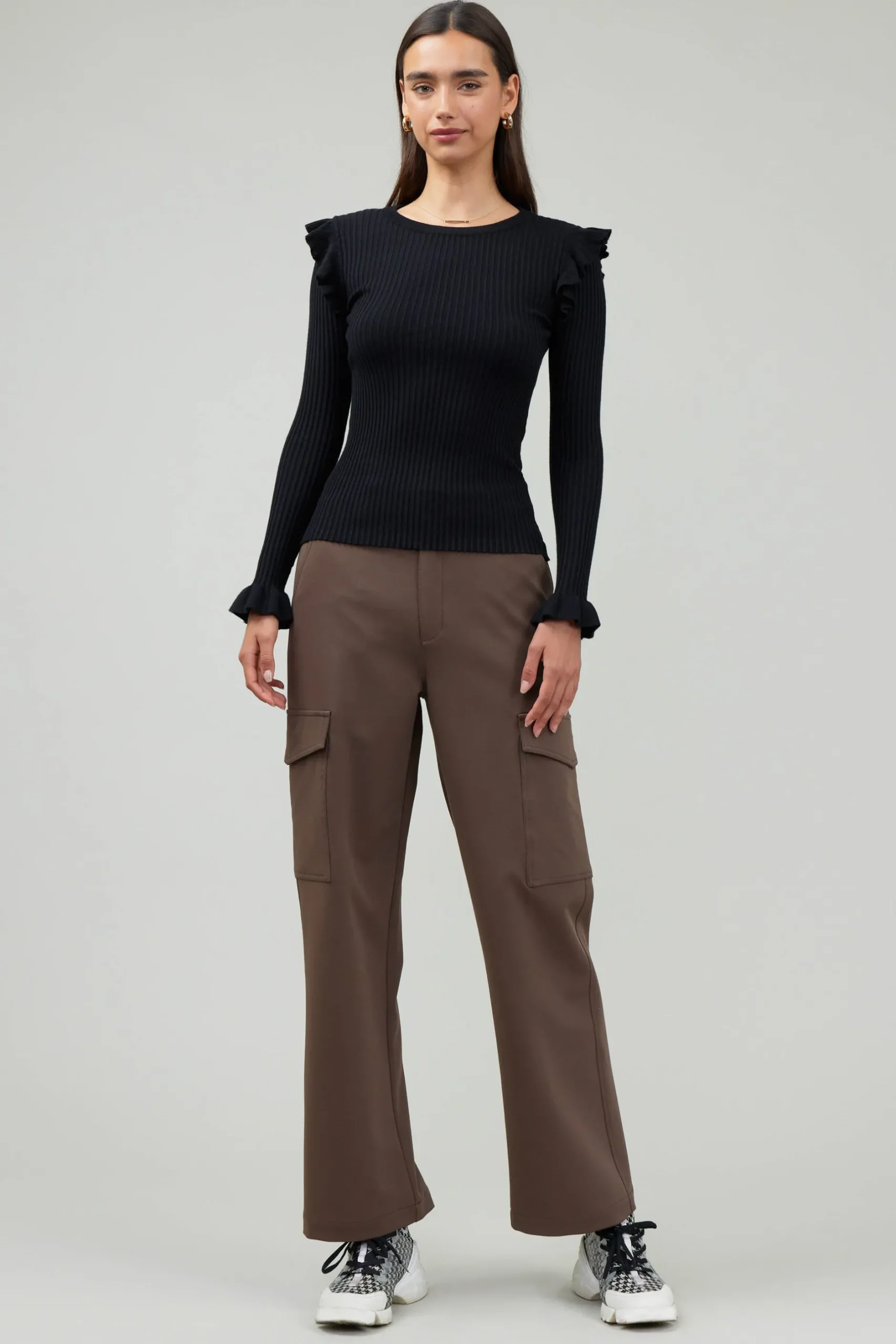 A long-sleeve sweater, reimagined with a feminine touch. Ruffle detailing accents the shoulders of this soft and cozy knit.