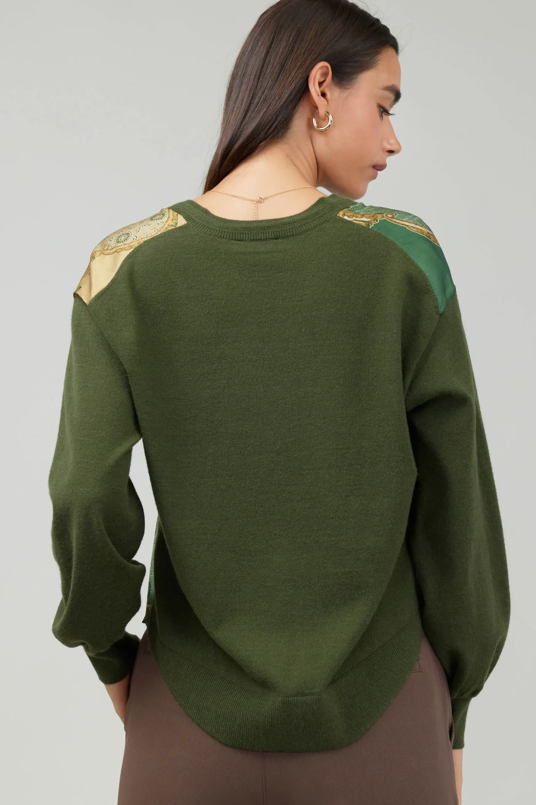 A tactile combination of materials comes together in an effortlessly put-together look. The cozy V-neck sweater contrasts against woven fabric, creating an enticing textural mix.