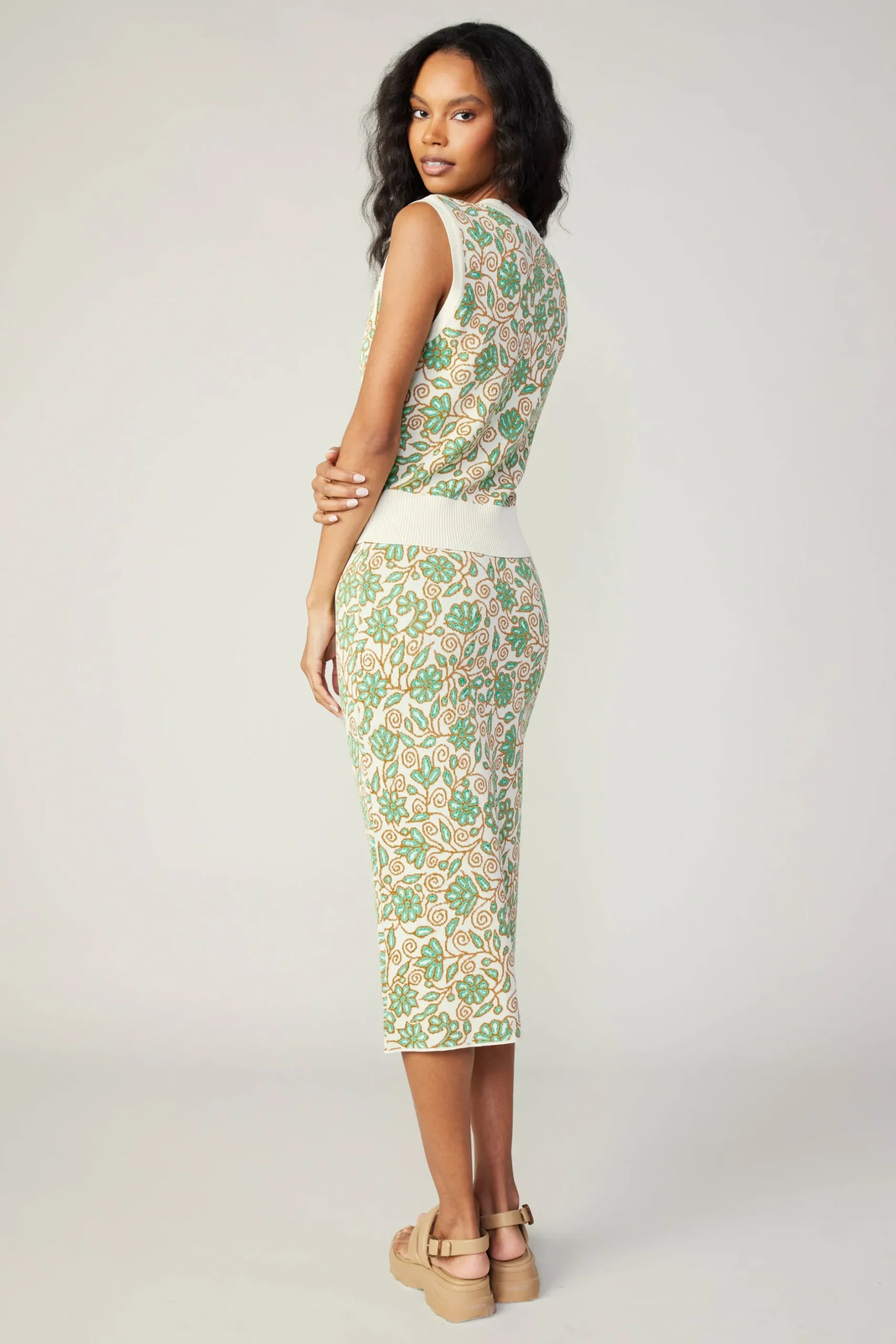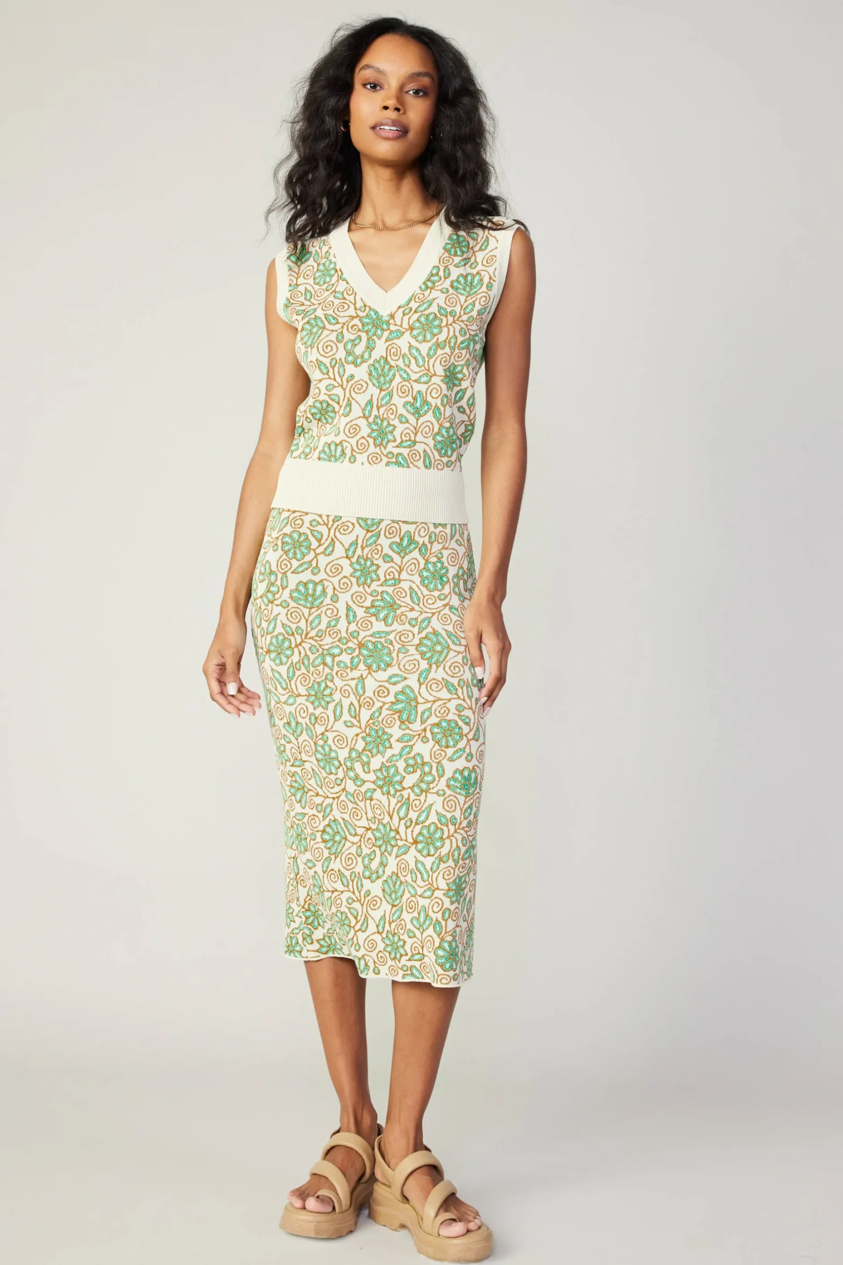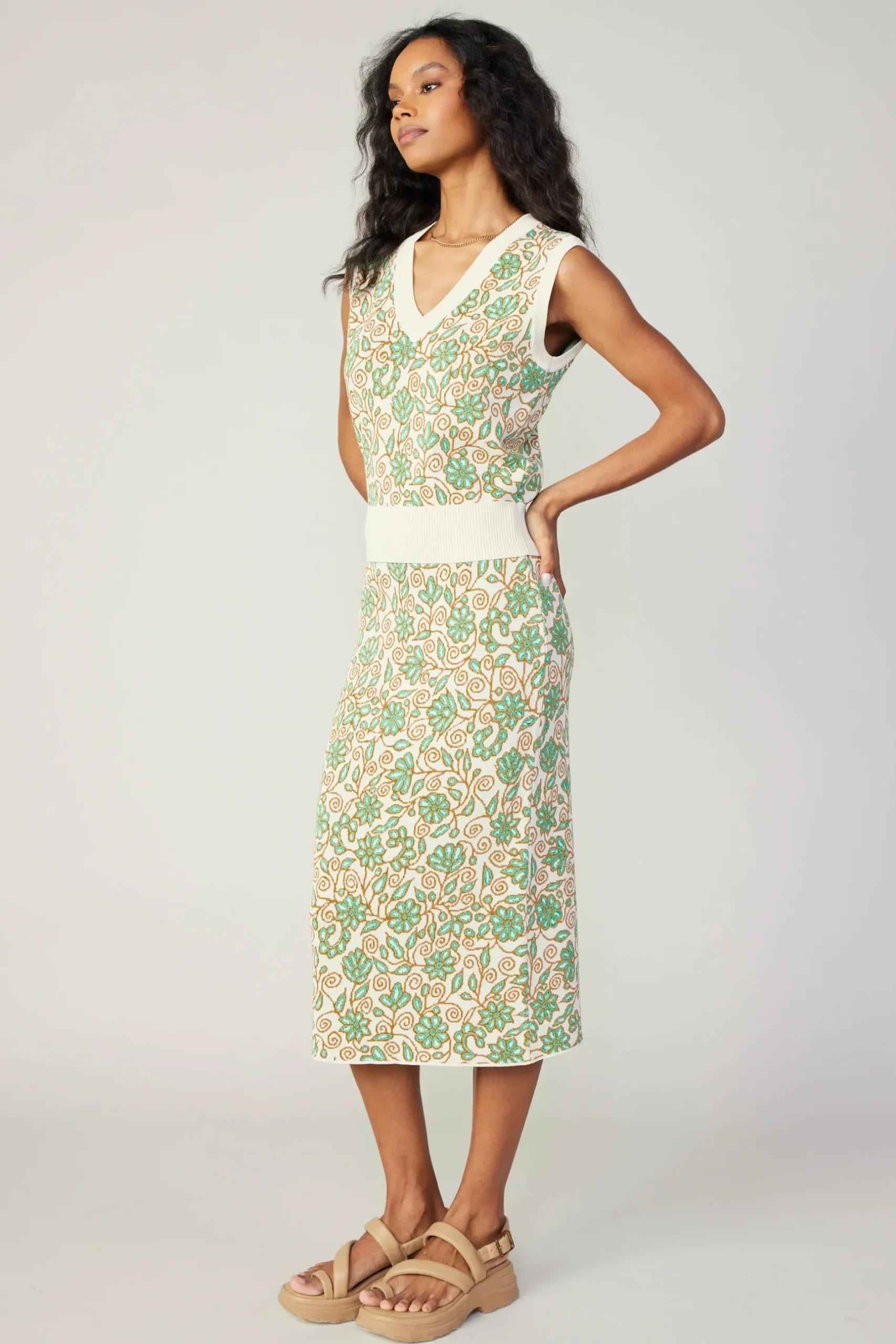 A fresh pick for your knitwear collection. This sweater vest is intarsia-knitted with a charming floral print. A deep V-neckline flatters the sleeveless silhouette. Ribbed edges add a touch of texture.