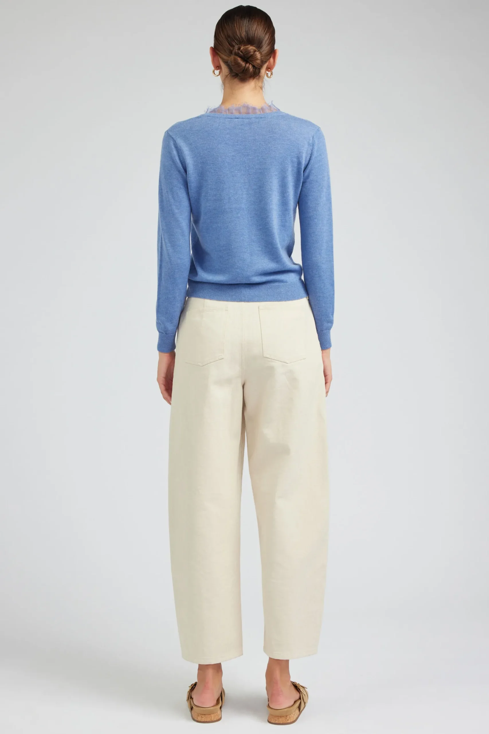 A classic long-sleeve sweater with a little something special. Done in a fine-gauge knit, it’s defined by a V-shaped neckline and accented by delicate eyelash lace.