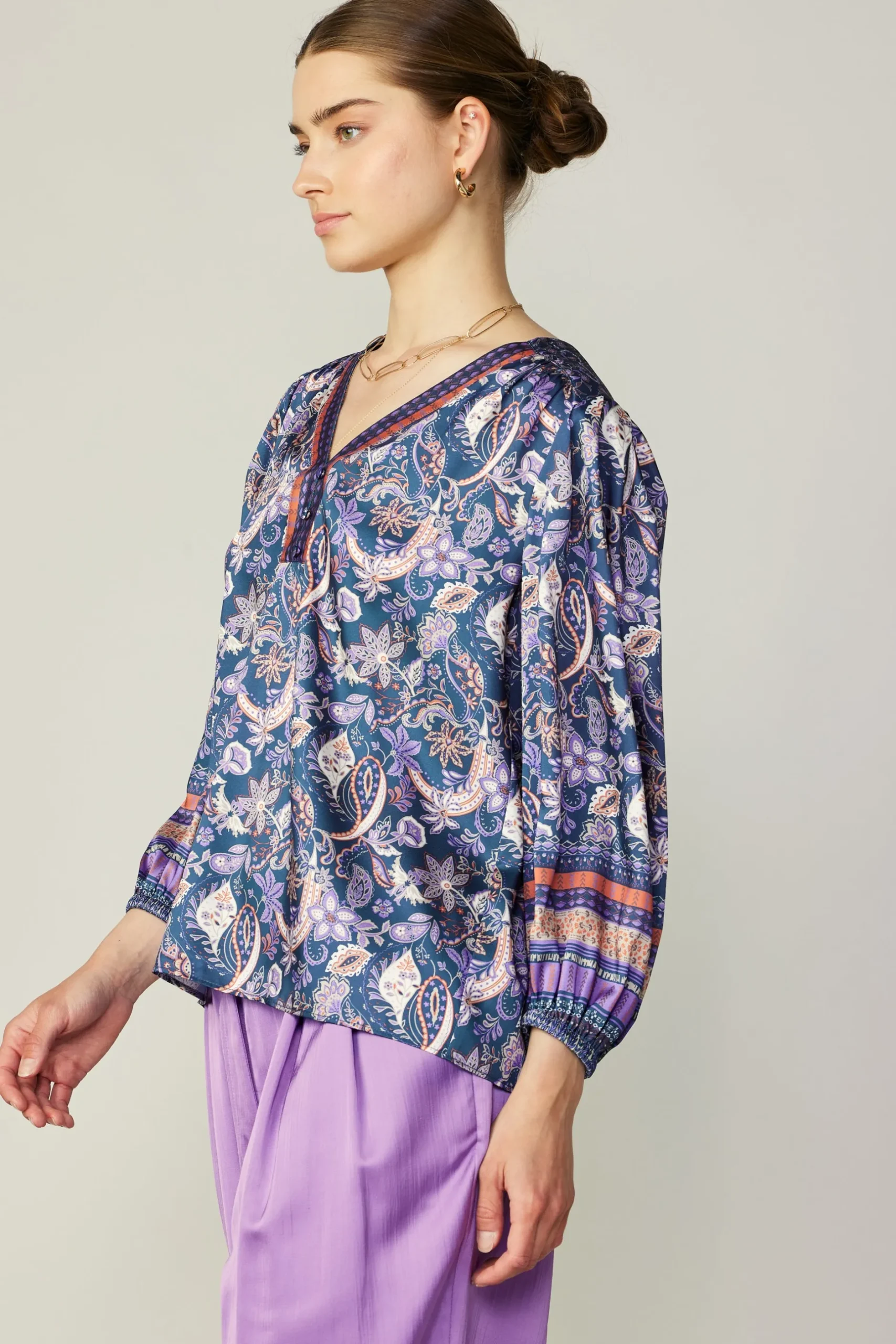 This blouse is a current favorite, and for good reason. It’s cut for a loose, easy shape with a Y-shaped neckline, covered buttons, and pleating at the shoulders. And then there’s the print—a charming floral motif framed by a geometric border.
