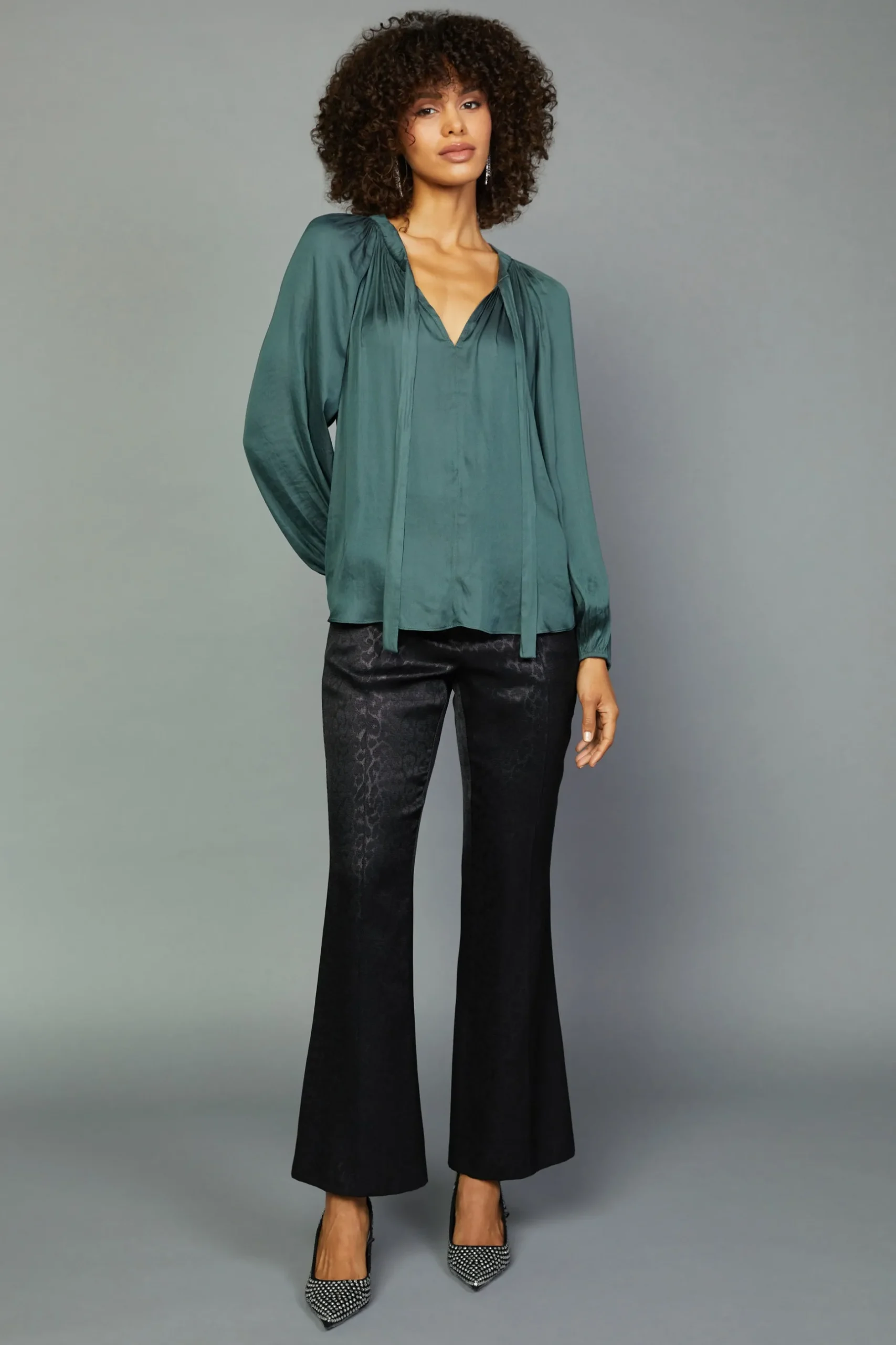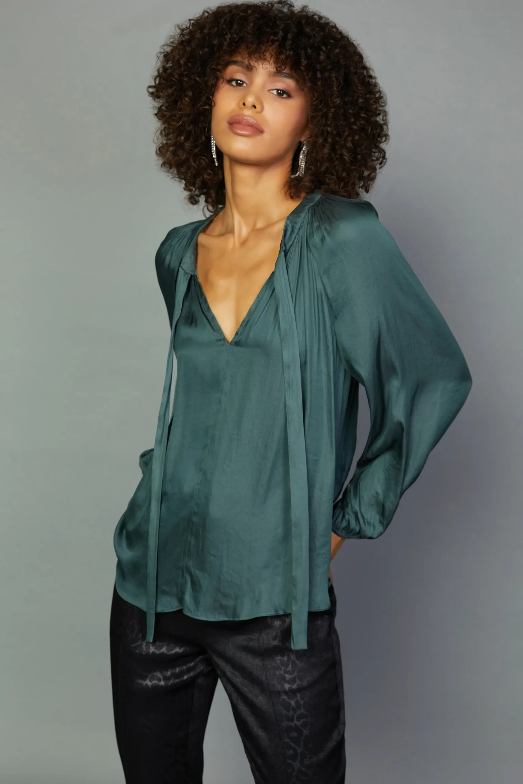Long Sleeve Tops-Current Air Gathered Bow Tie Blouse FORESTGREEN
