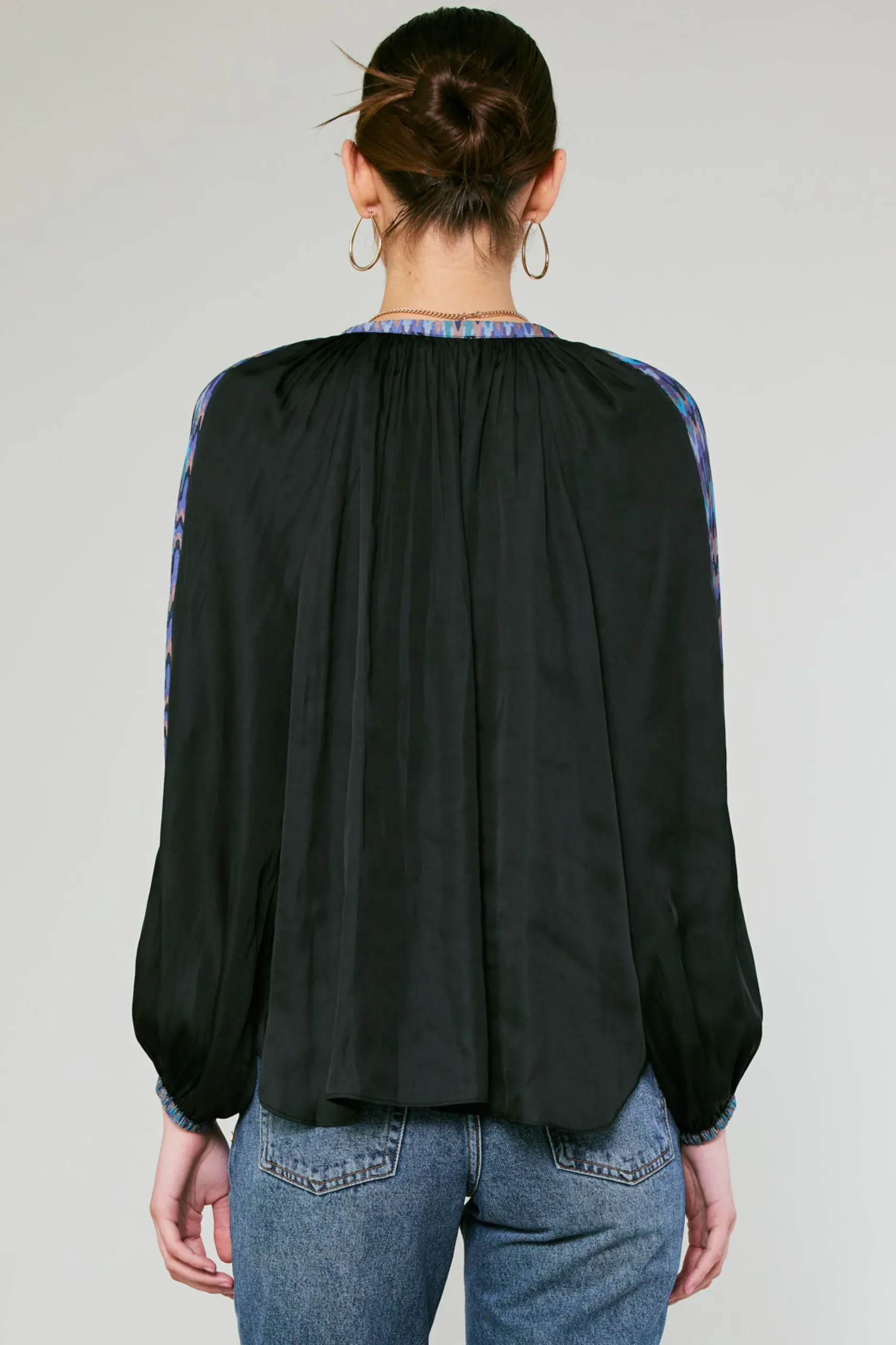 A dynamic mix of patterns makes this split-neck top a work of art. geometric elements create a collage effect, on the sleeves for a unique look.
