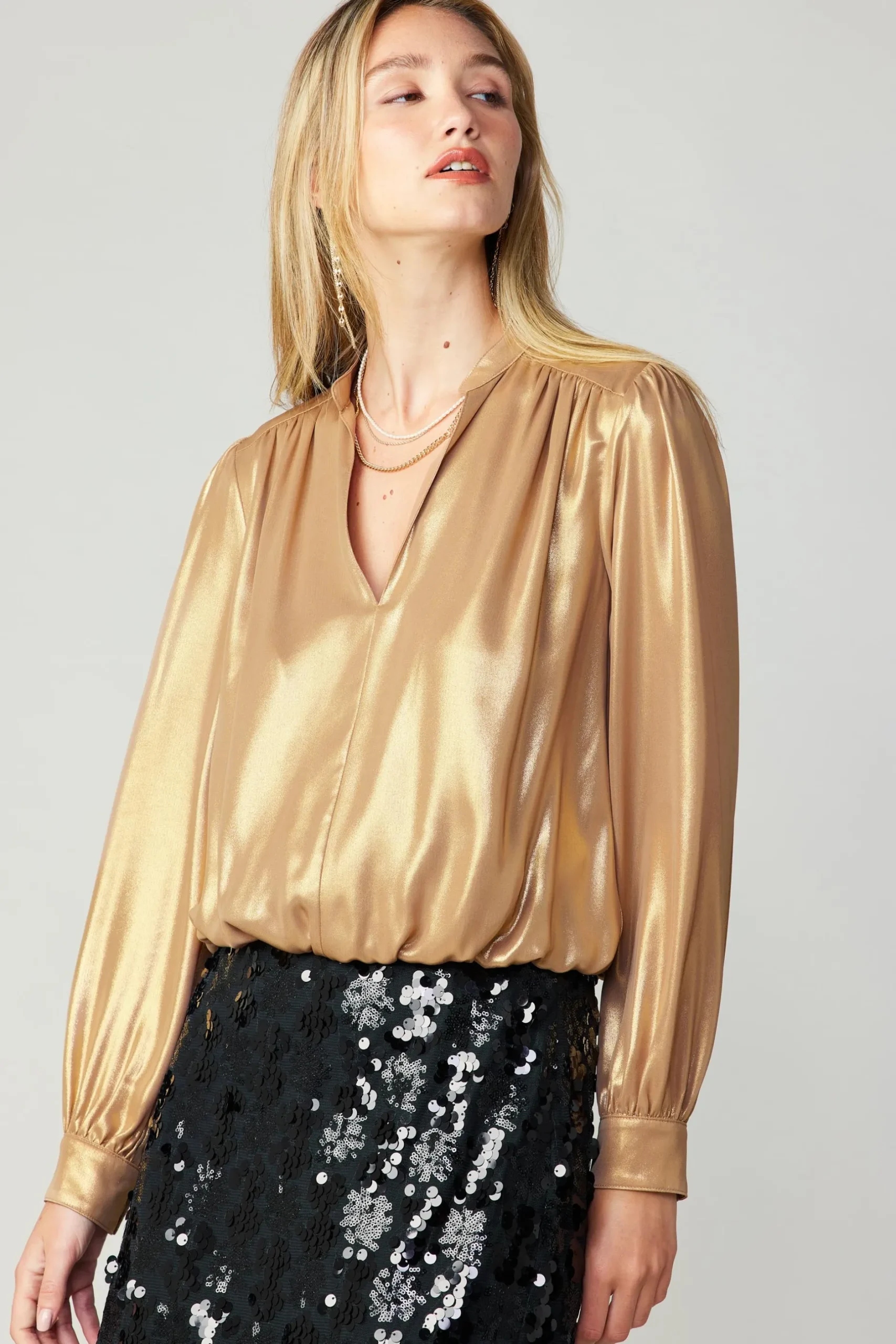 This split-neck blouse has a decadent feel thanks to its lustrous metallic sheen. It has gentle gathers and puffed long sleeves finished by button cuffs.