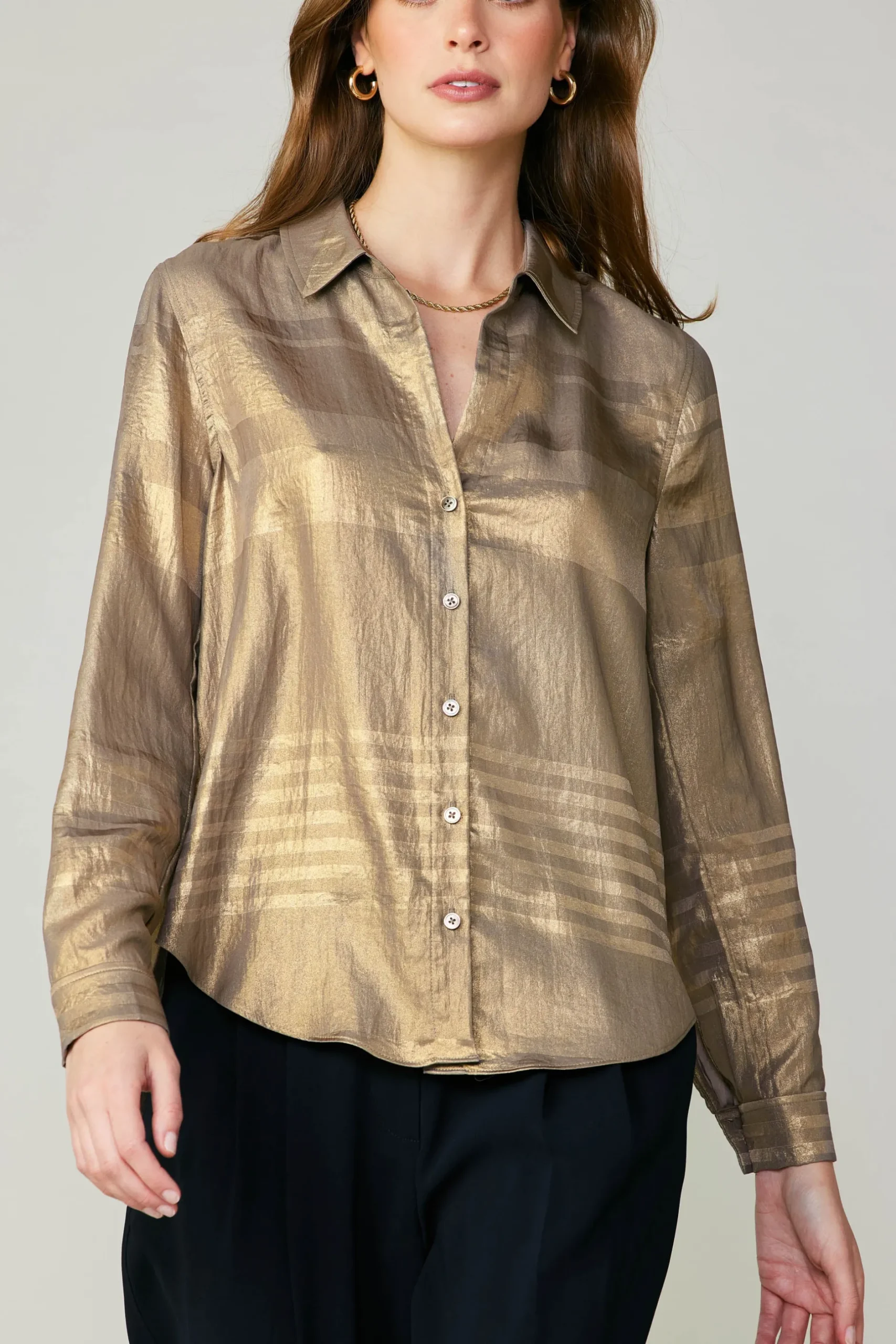 The classic button-up shirt gets a party-ready update with a metallic shimmer and understated stripes. Featuring a gently crinkled texture, this long-sleeve style has a spread collar, shirttail hem, and a single pleat at the back.