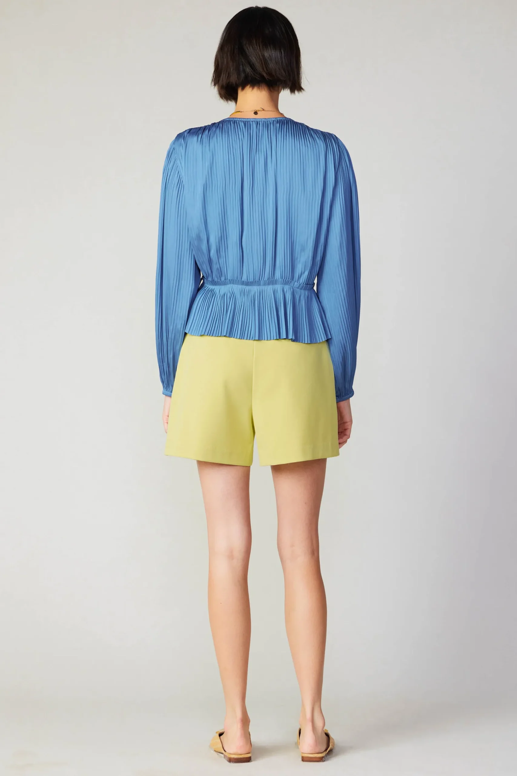 This lustrous wrap top ties at the side and has hundreds of tiny pleats that create an incredibly cool texture. It’s complete with long sleeves and a shape-enhancing peplum.