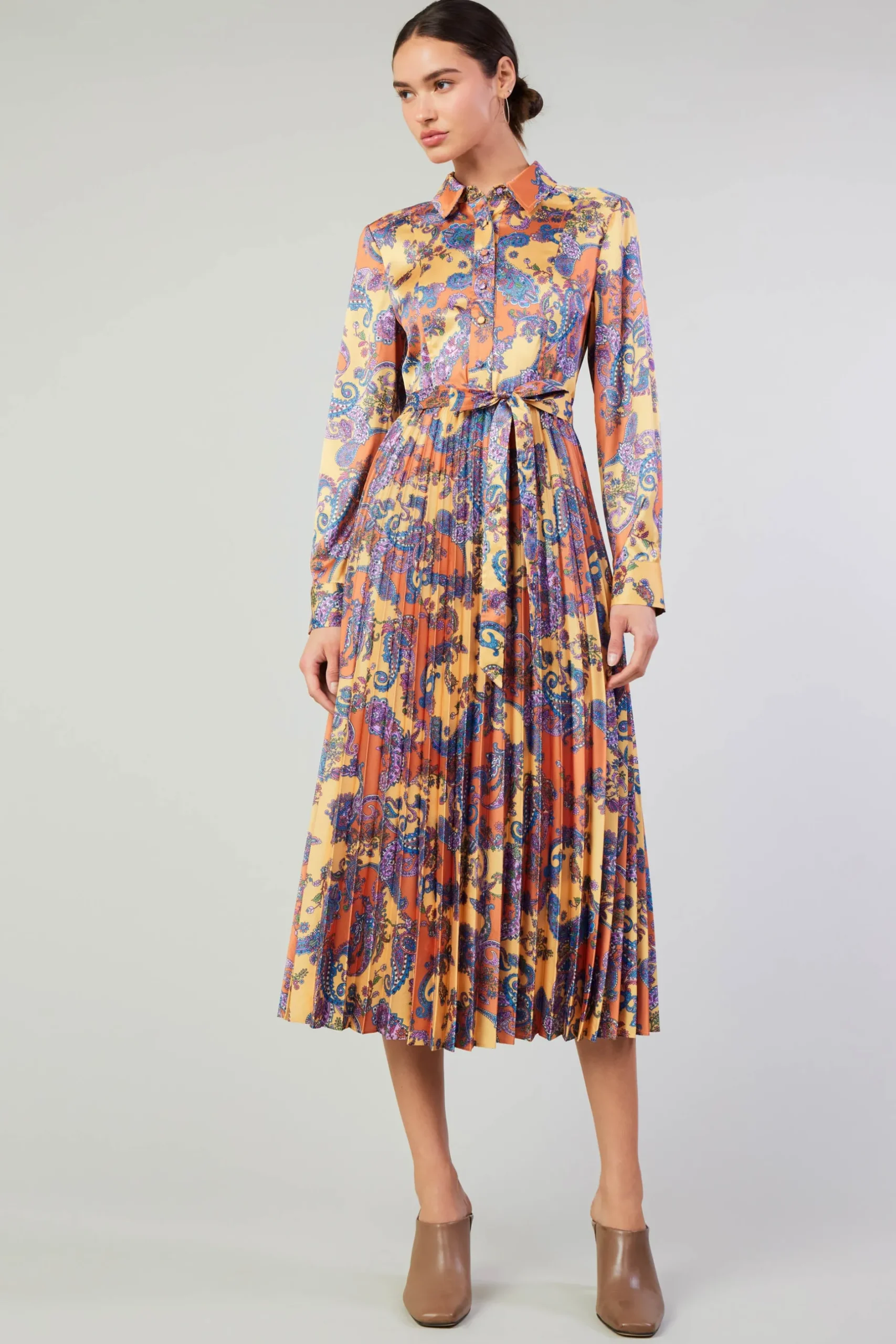 Pleated, printed, lots of personality. Inspired by a nostalgia for retro style, this paisley-patterned dress has a smart spread collar, covered buttons, and a self-tie belt that cinches the shape. Below the waist? Twirly, shin-skimming pleats that love to move.