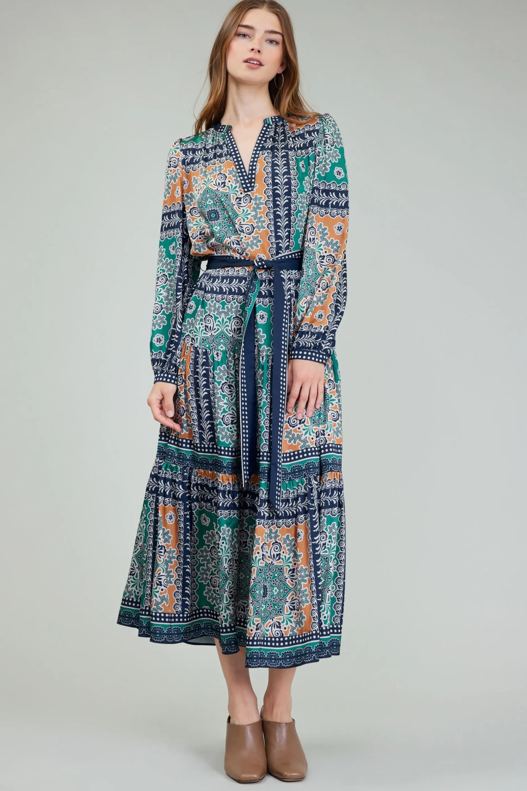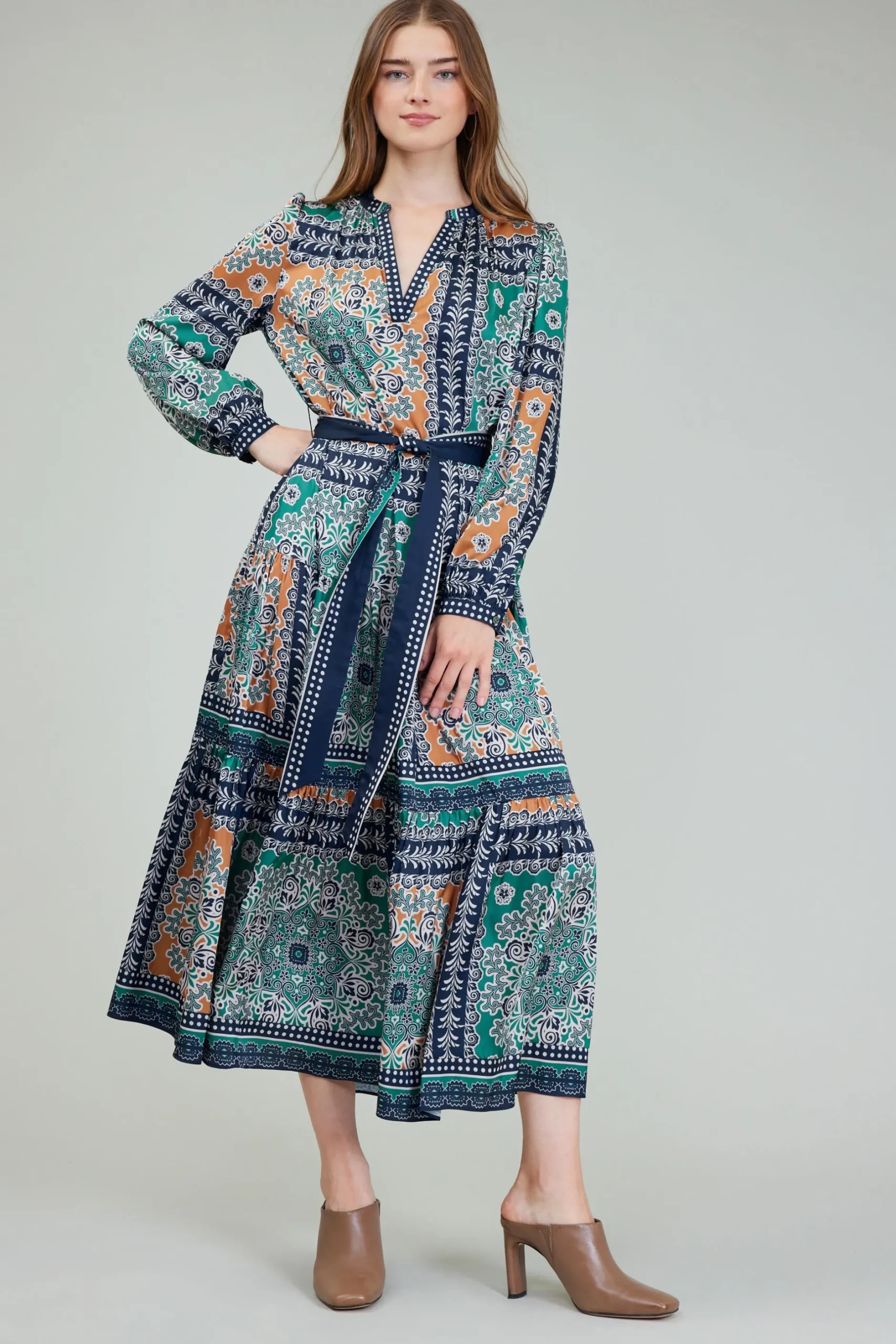 This split-neck dress showcases an intricate print with dotted trim along the neckline, cuffs, and tiered skirt. Framed by puffed sleeves, it ties at the waist and flows effortlessly to a shin-grazing hem.