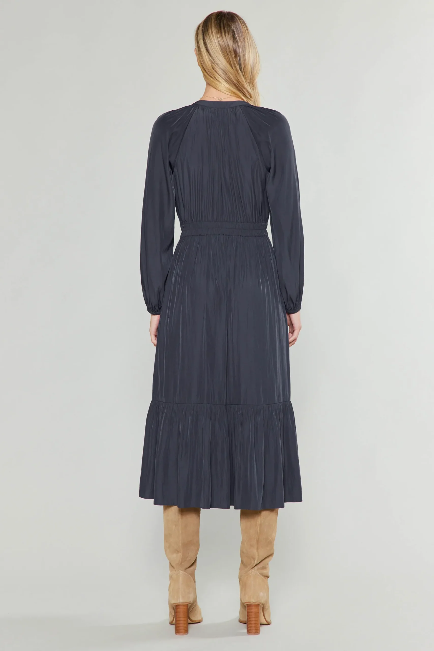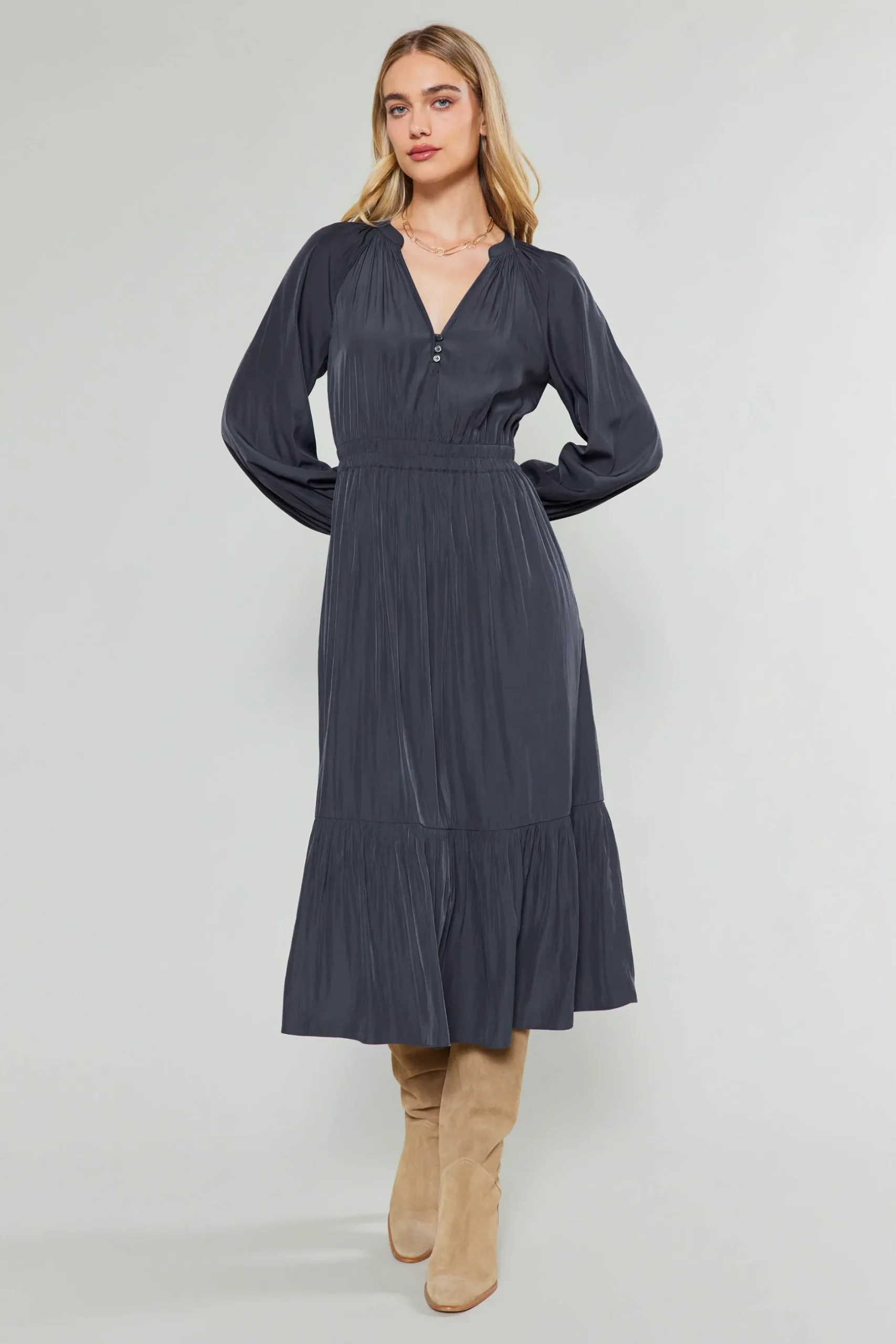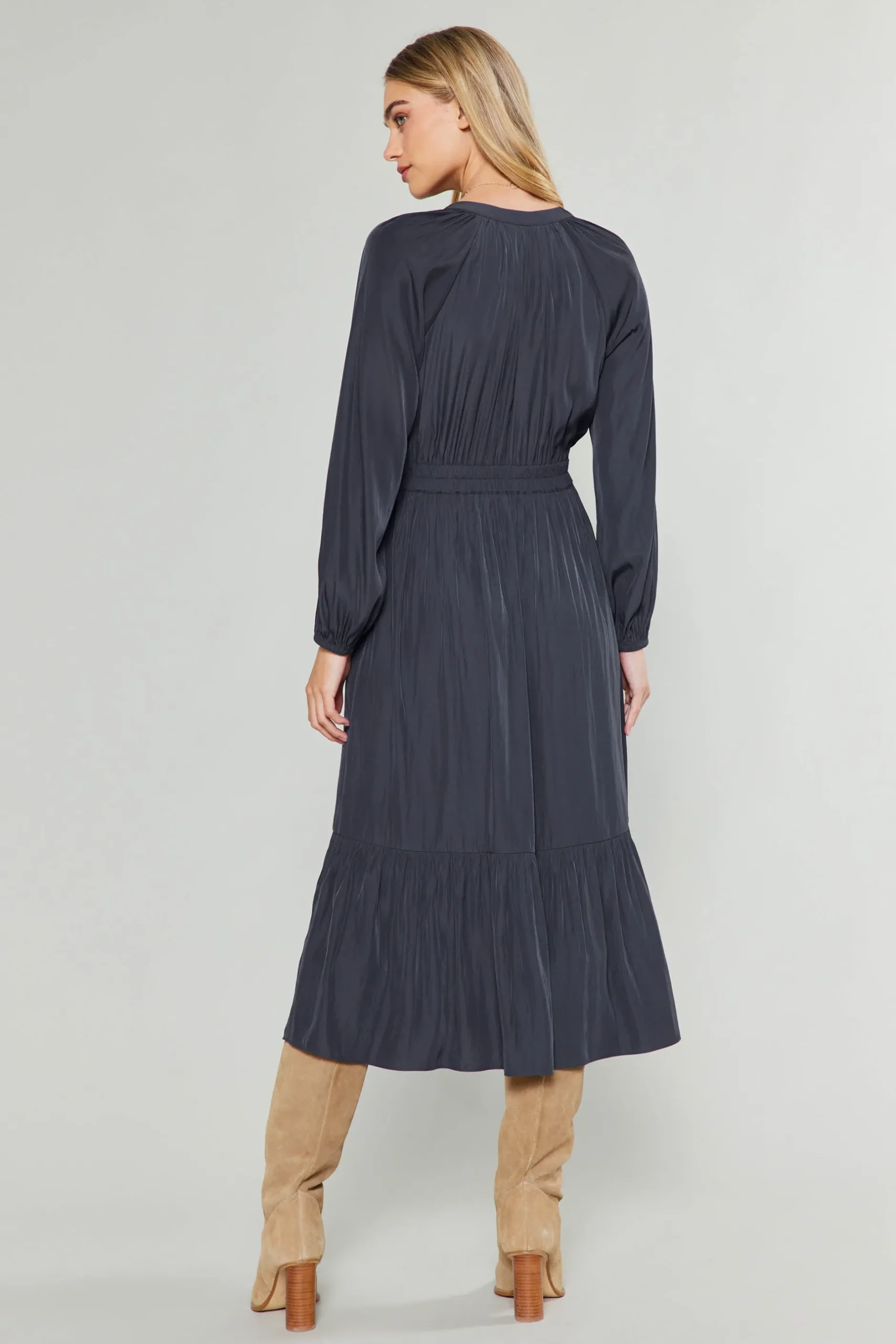 A plunging V-shaped neckline with a mandarin collar and delicate buttons starts this midi dress on a flattering note. The comfortable cinched waist keeps it going, creating definition at the waist as the skirt flows to a shin-skimming tiered hem.