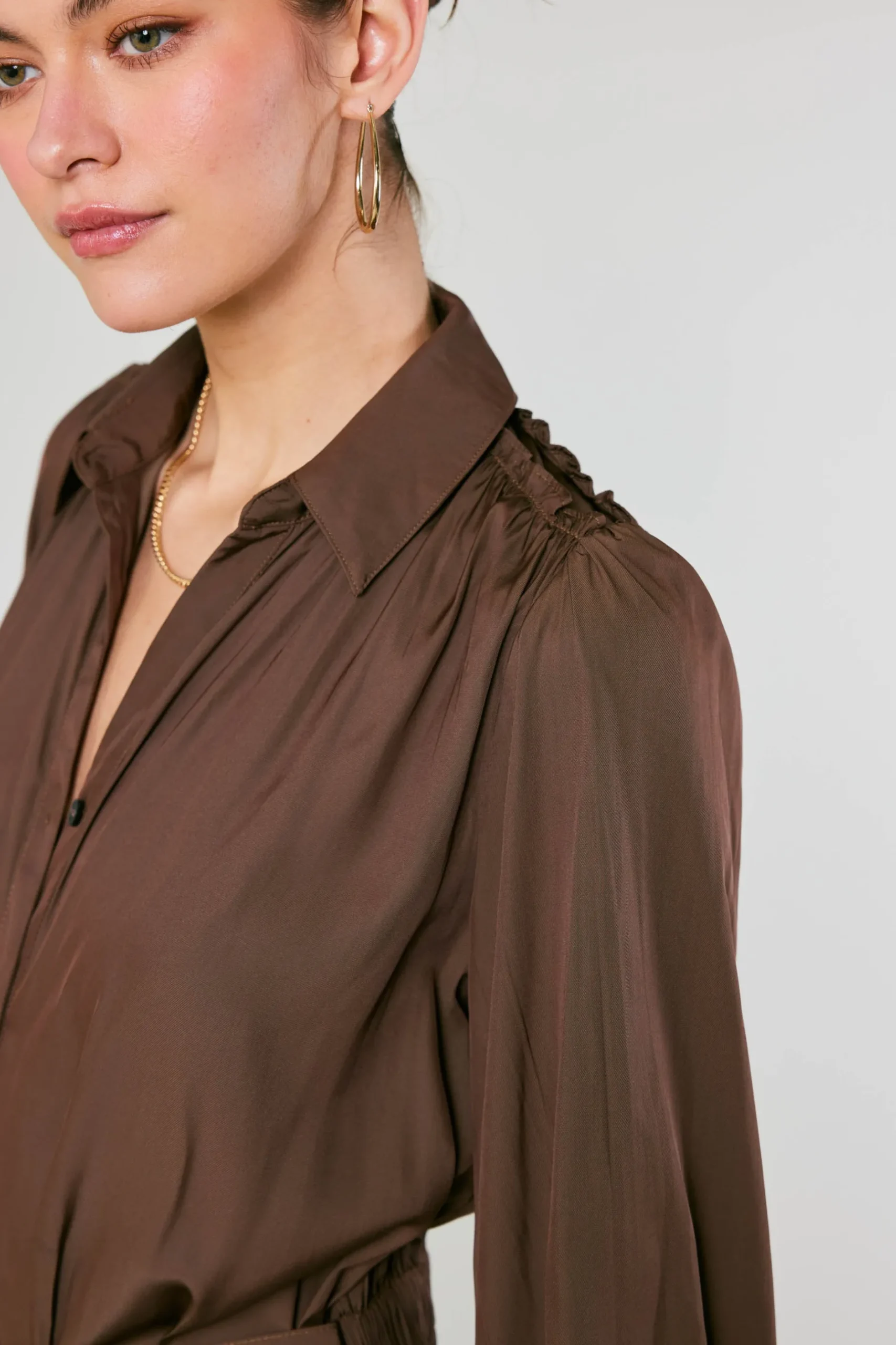 The classic shirt dress, refreshed. Designed with an open neckline and spread collar, this long-sleeve number buttons up at the front and features gently gathered shoulders. Cinch the waist with the matching D-ring belt.