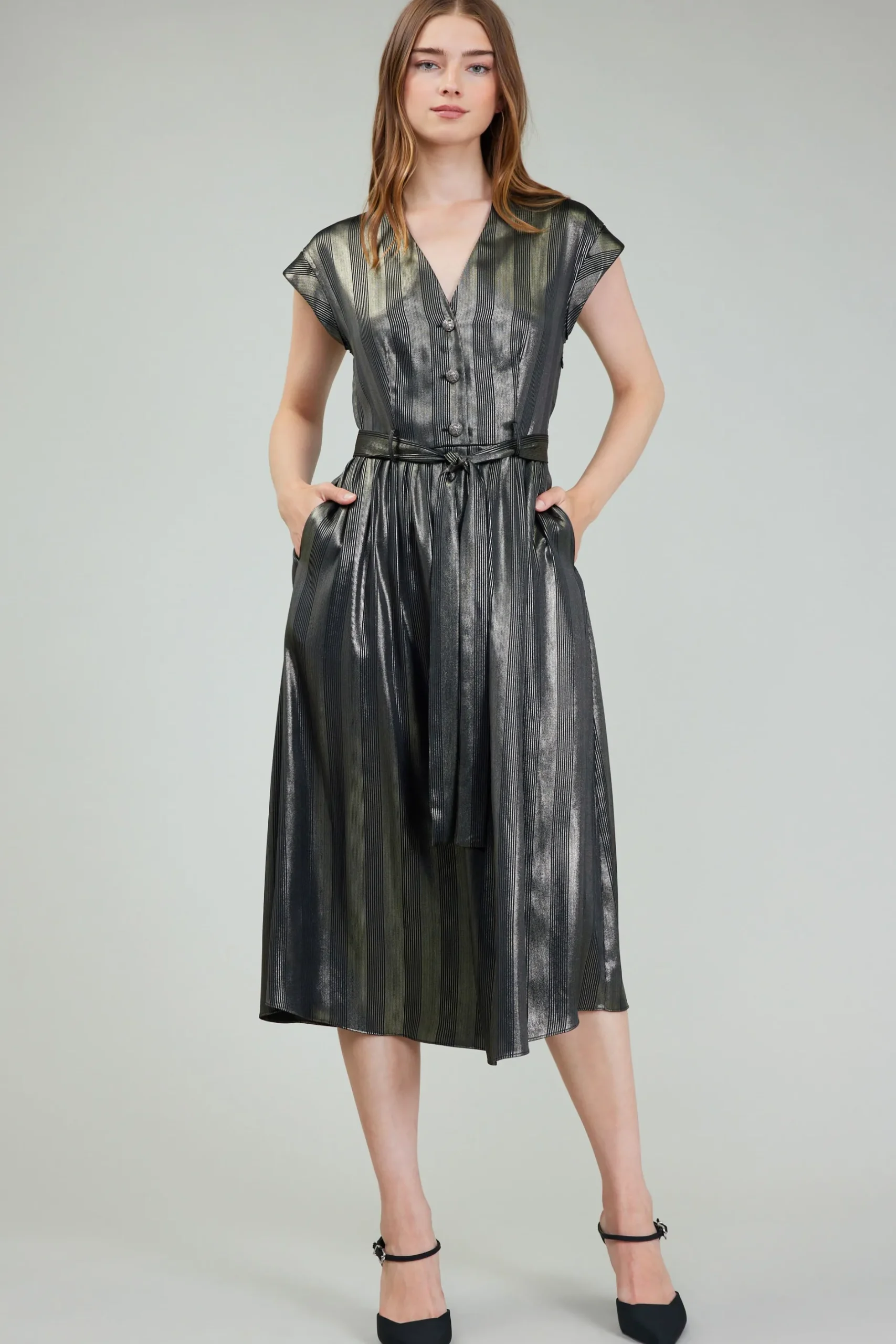 This V-neck midi dress shines with its gold and black stripe motif. Featuring rolled short sleeves and embossed metal buttons, it’s got a self-tie belt accentuates the waist.