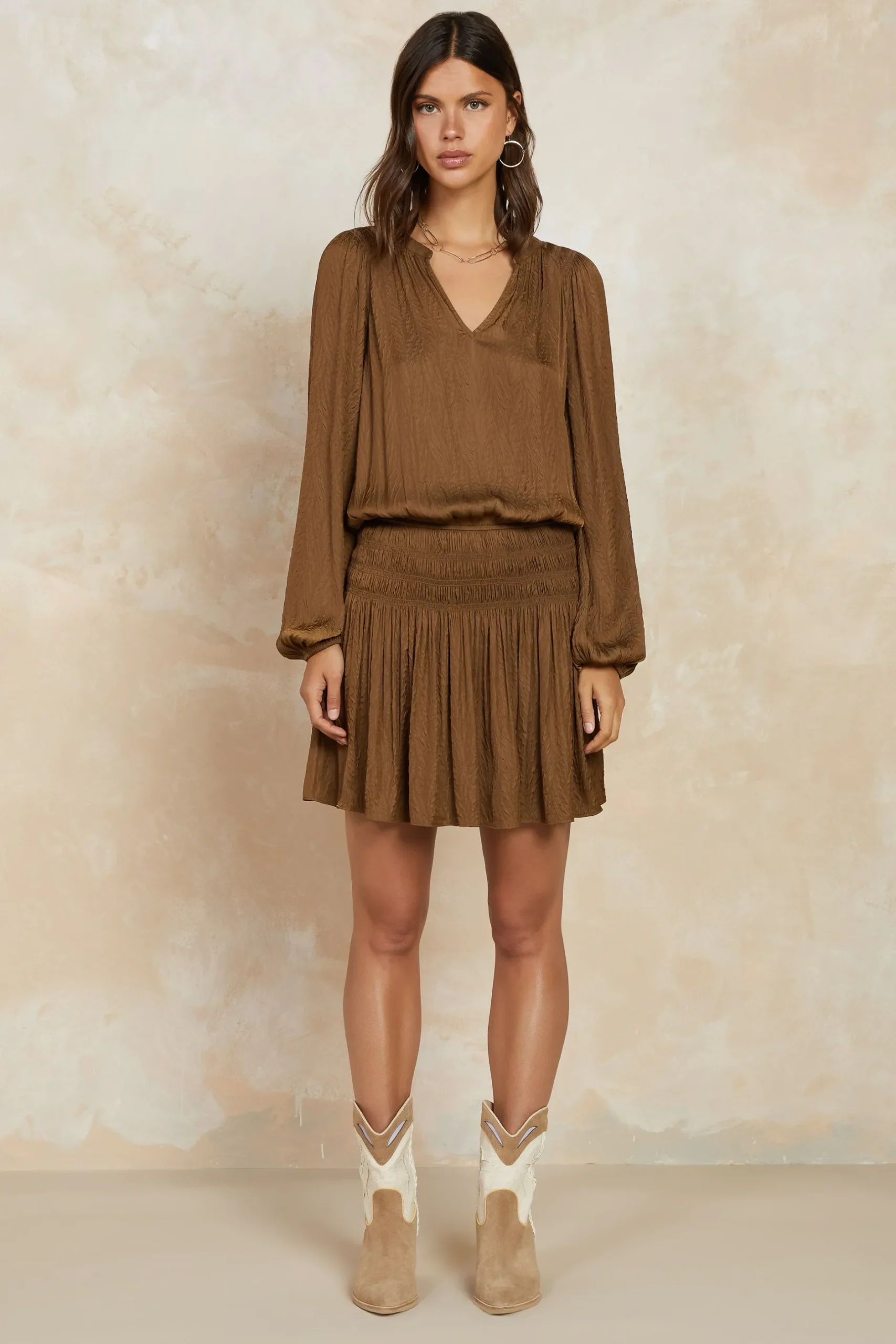 The crinkled texture isn’t the only thing we love about this little mini dress. The long-sleeve number has a bit of smocking at the shoulders, plus it’s super flattering with its split neckline and elasticized waist.