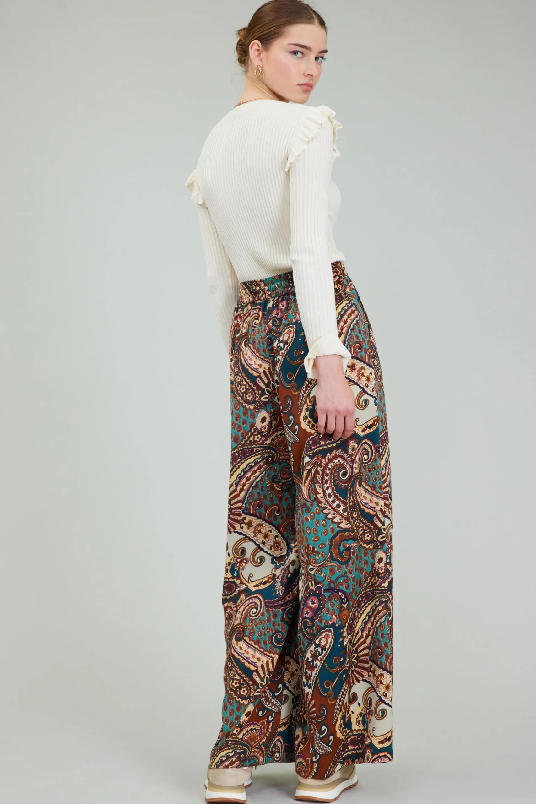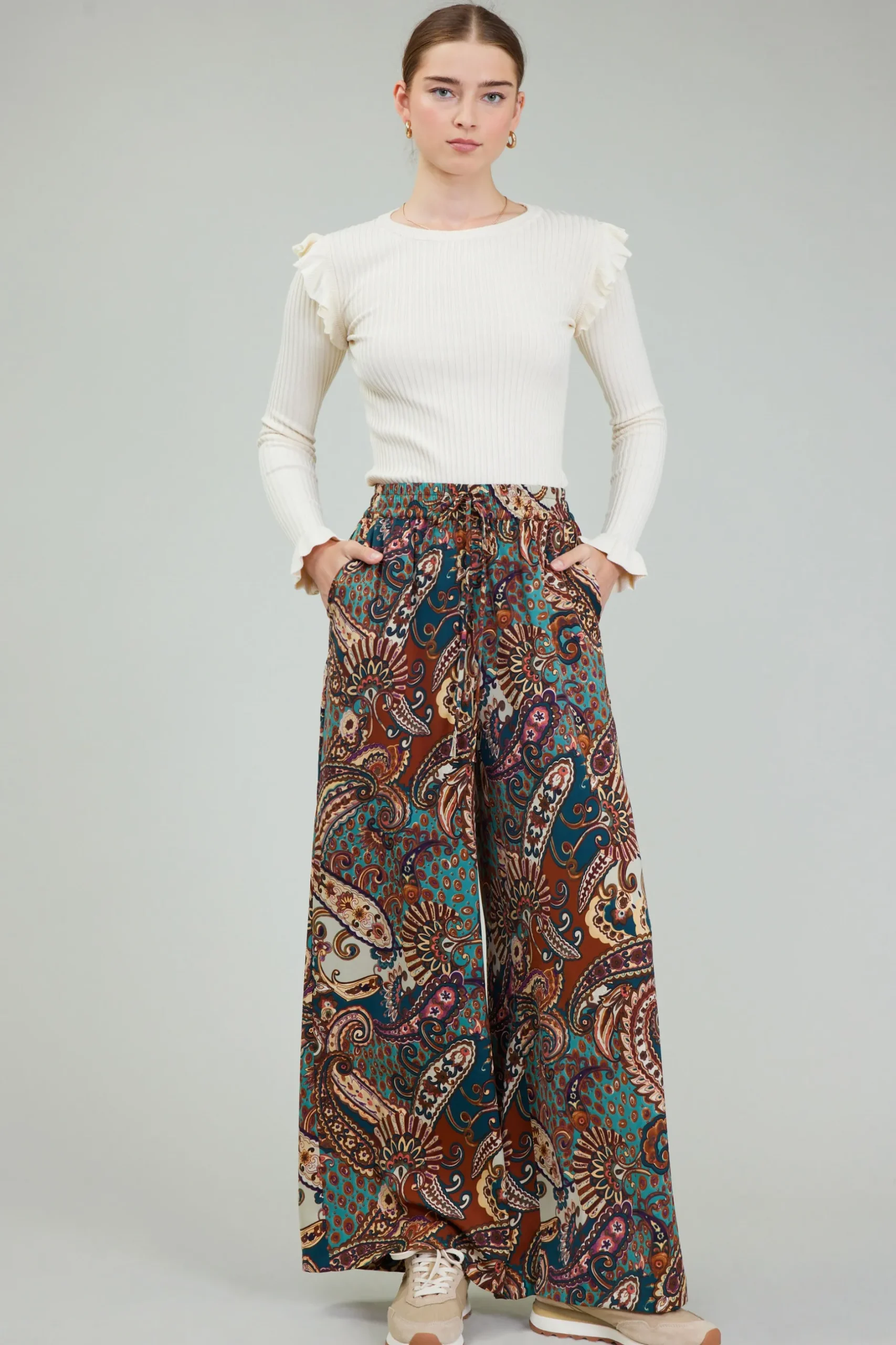 These high-waisted pants feature a full-length silhouette with the ease of an elastic waistband. The mix of various prints create a one-of-a-kind look.
