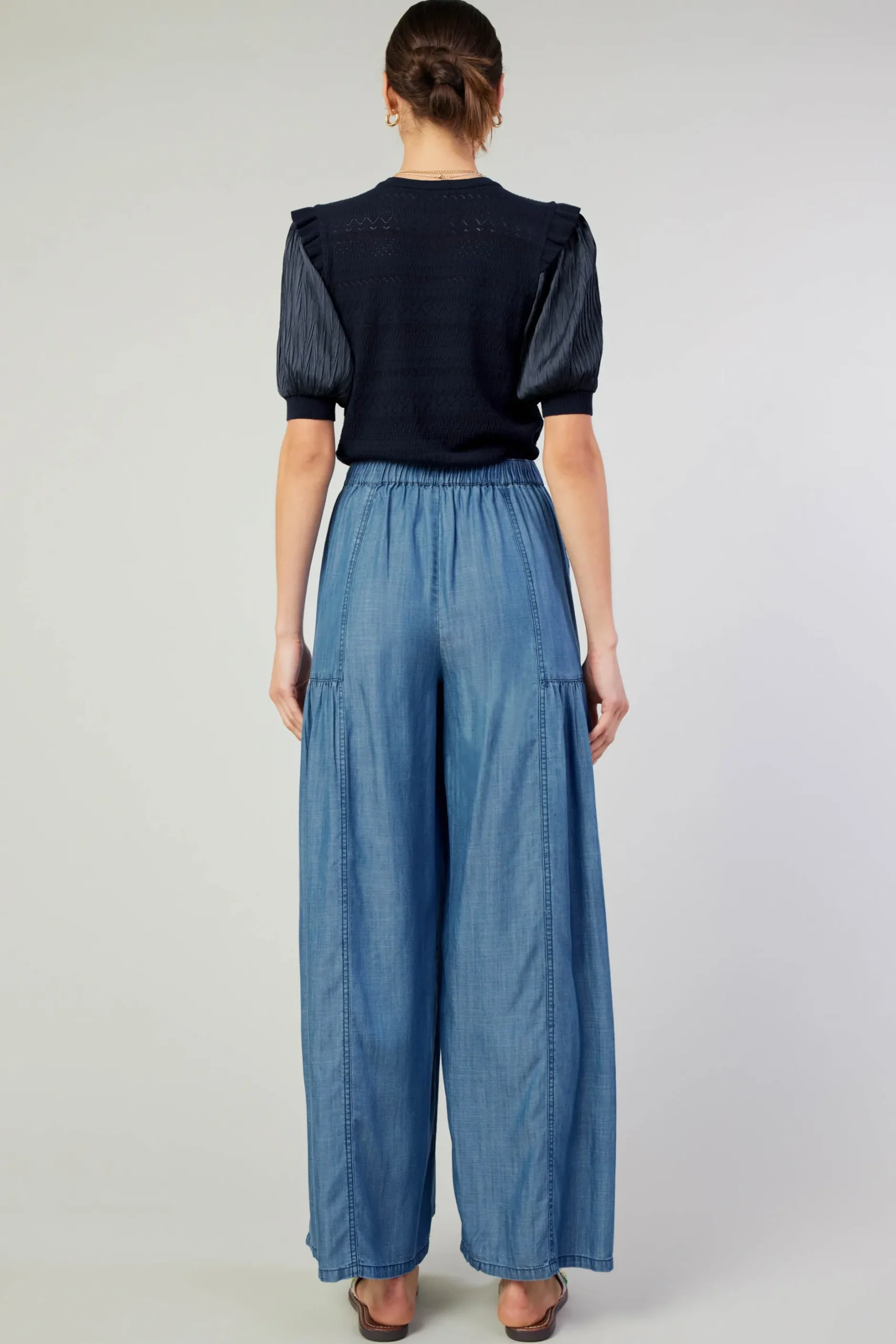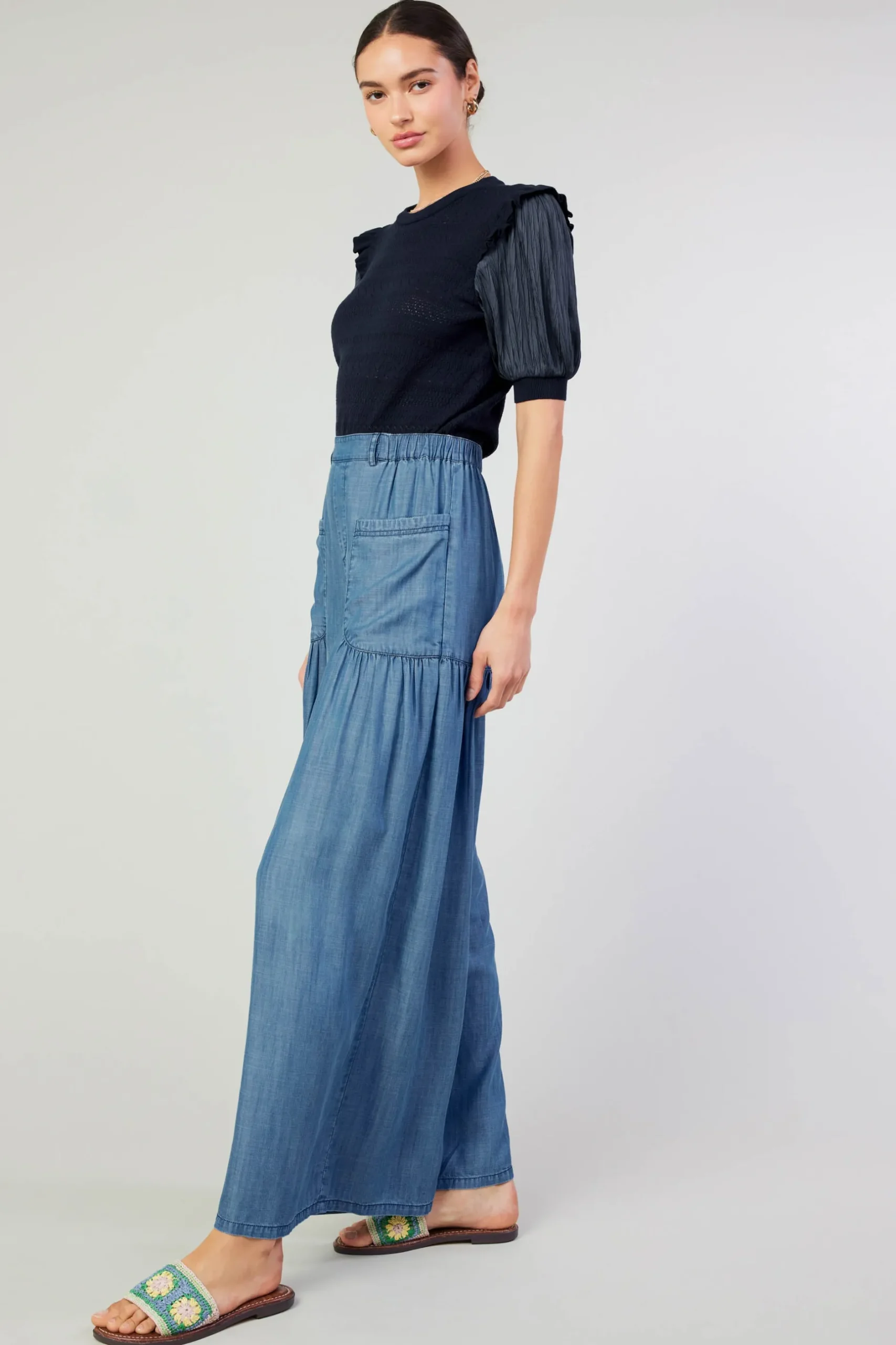 Hot days call for chambray. Put these beachy wide-leg pants on your essentials list. Designed with an elasticized waist, the pair has a loose, flowy silhouette with round pockets, tiered paneling, and gathered details.