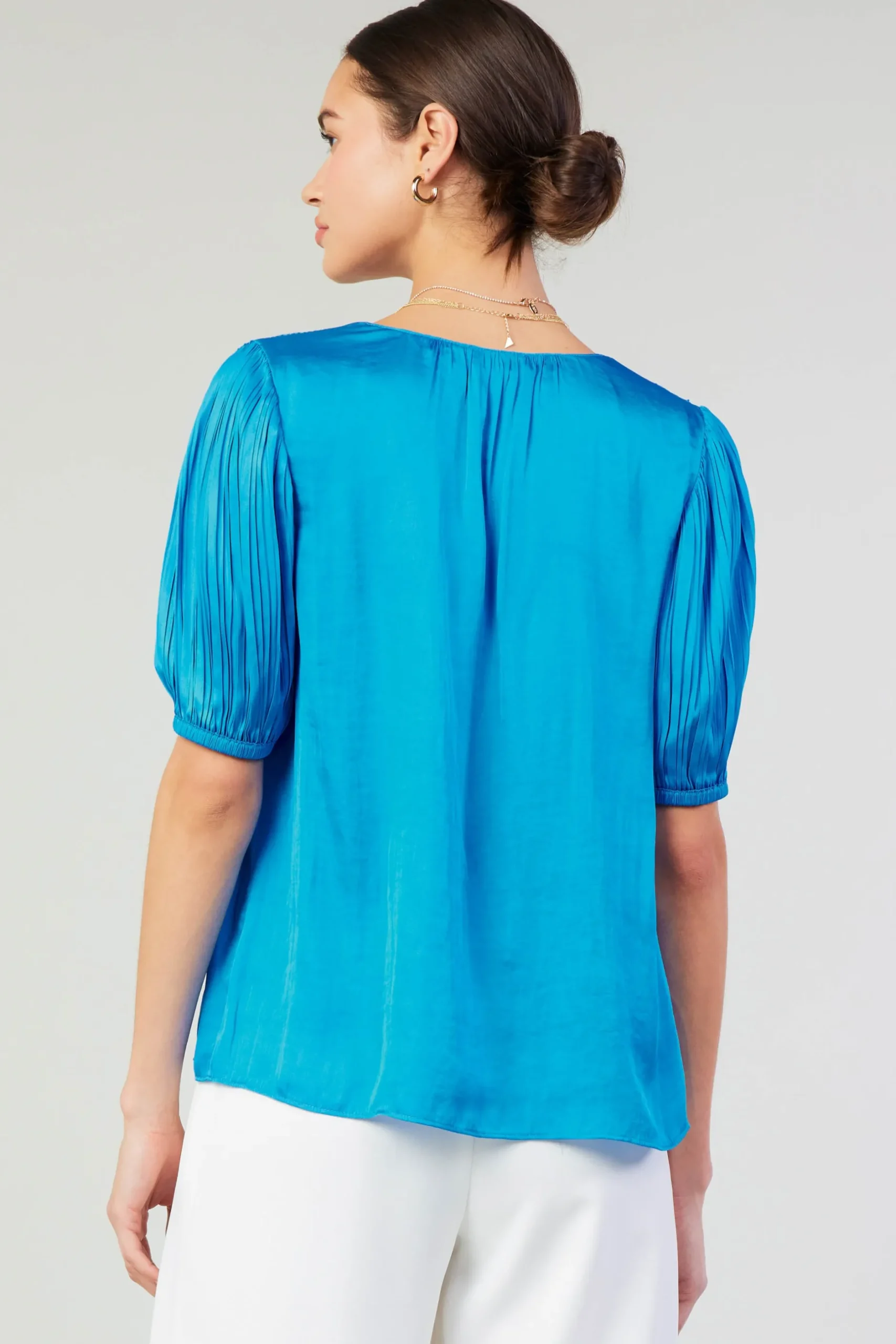 The brighter side of the season. This V-neck blouse comes in a mood-boosting shade of blue to highlight the style’s smocked shoulders and pleated sleeves.