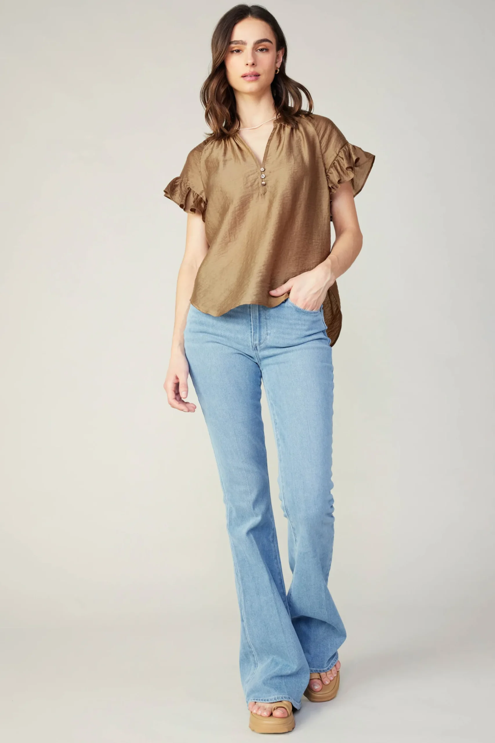 Framed by a flourish of ruffles, this whisper-light top has short raglan sleeves and a plunging neckline finished with petite buttons. The popover style is loose and relaxed, cut into a high-low silhouette.