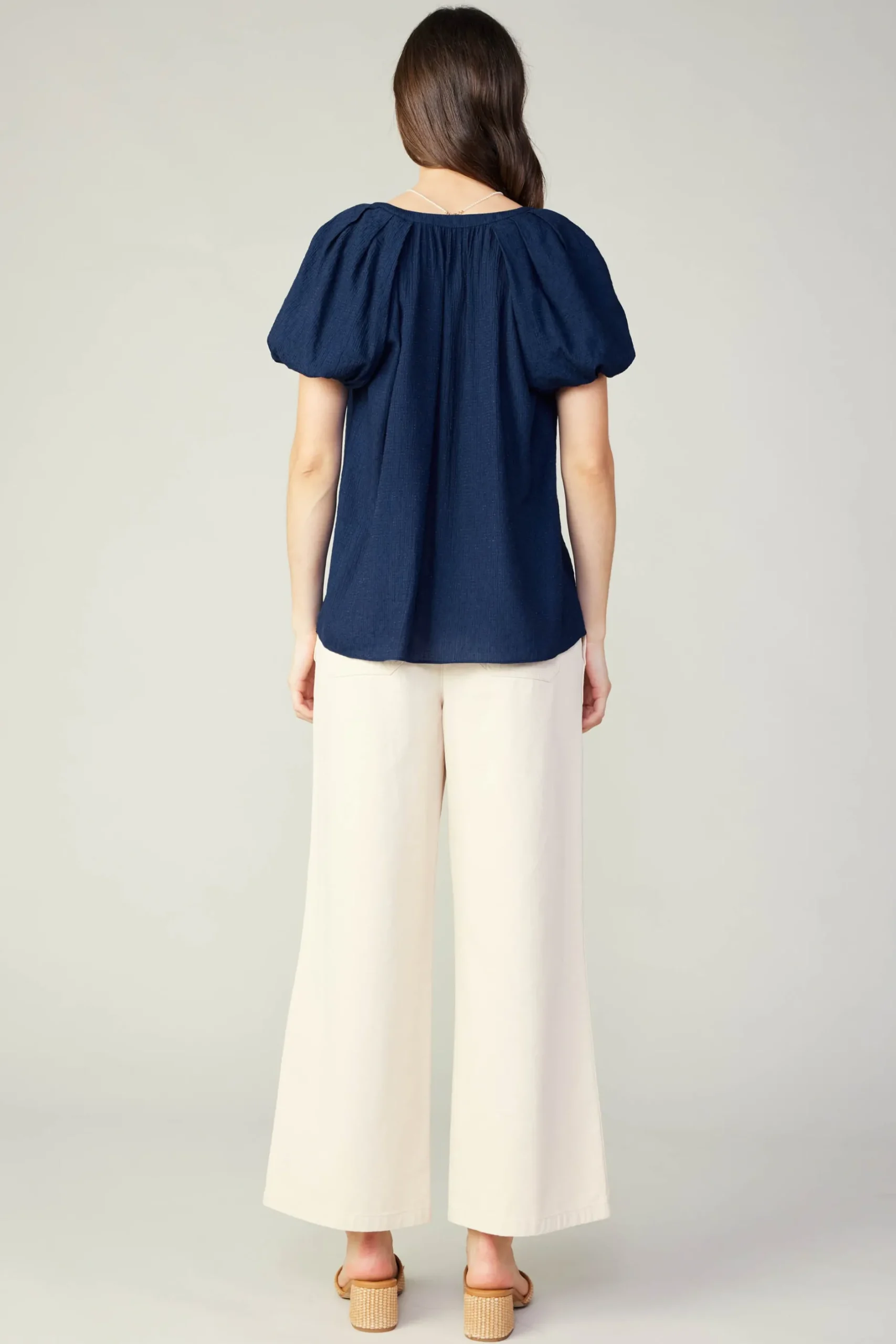 Between the split neckline and bubble sleeves, this airy blouse is effortlessly feminine. It practically floats off the body, crafted from a rayon blend fabric. Style it for work or the weekend.