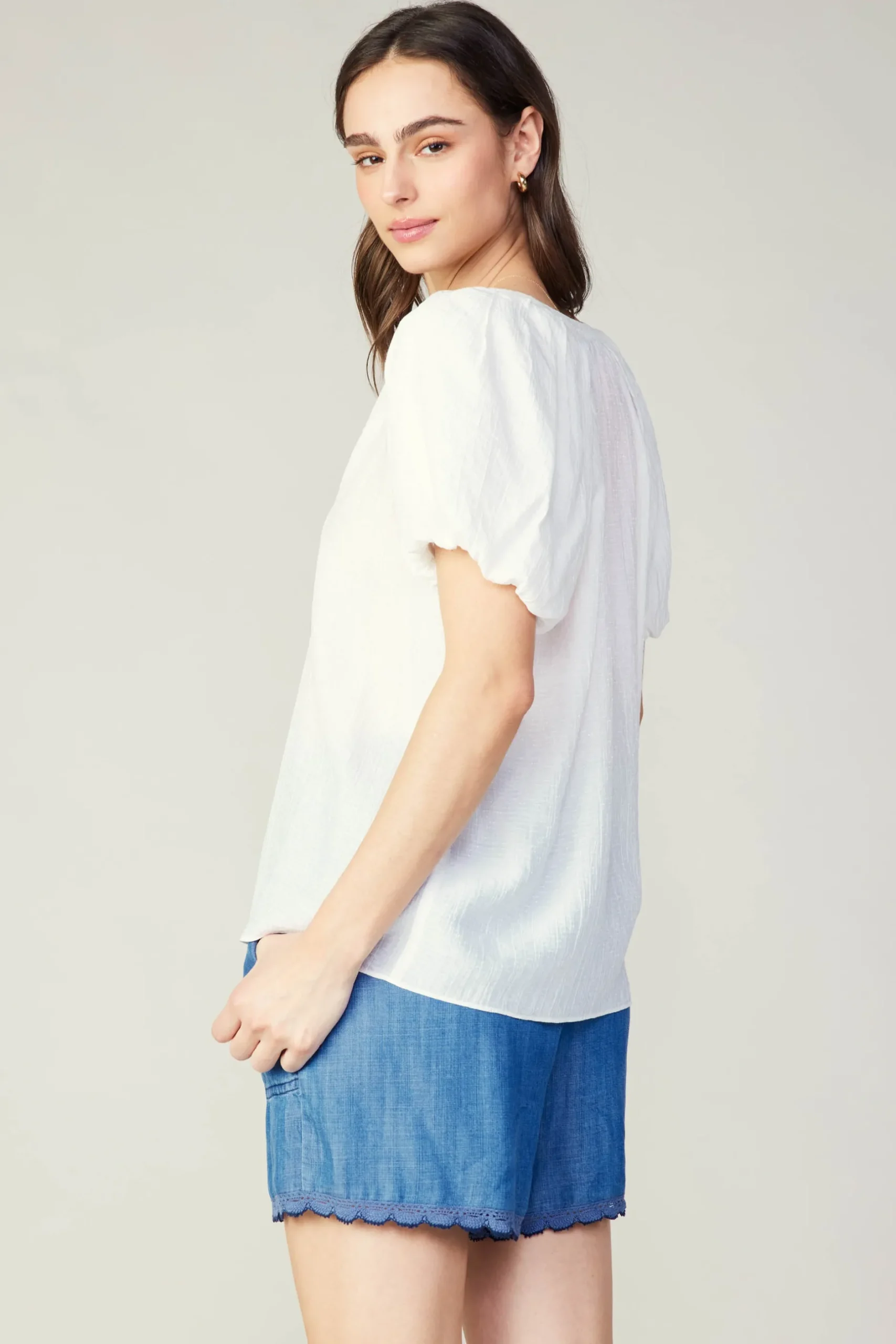 Between the split neckline and bubble sleeves, this airy blouse is effortlessly feminine. It practically floats off the body, crafted from a rayon blend fabric. Style it for work or the weekend.