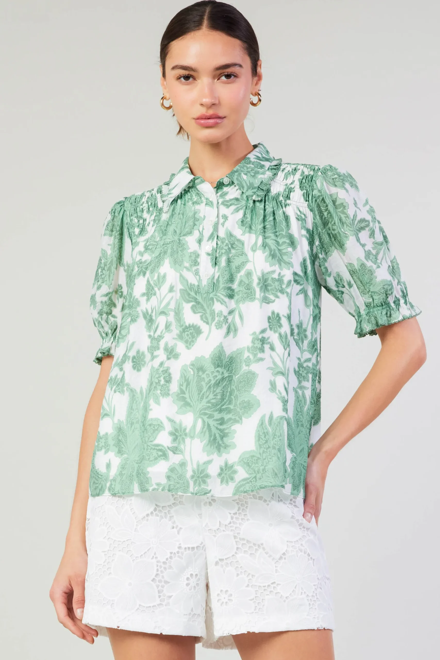 A lush green floral print lends a retro vacation vibe to this subtly sheer blouse. Topped by a pointed collar and buttoned half placket, it’s got all kinds of pretty details. Get a closer look at the smocked shoulders, ruffle trim, and picot stitching at the cuffs.