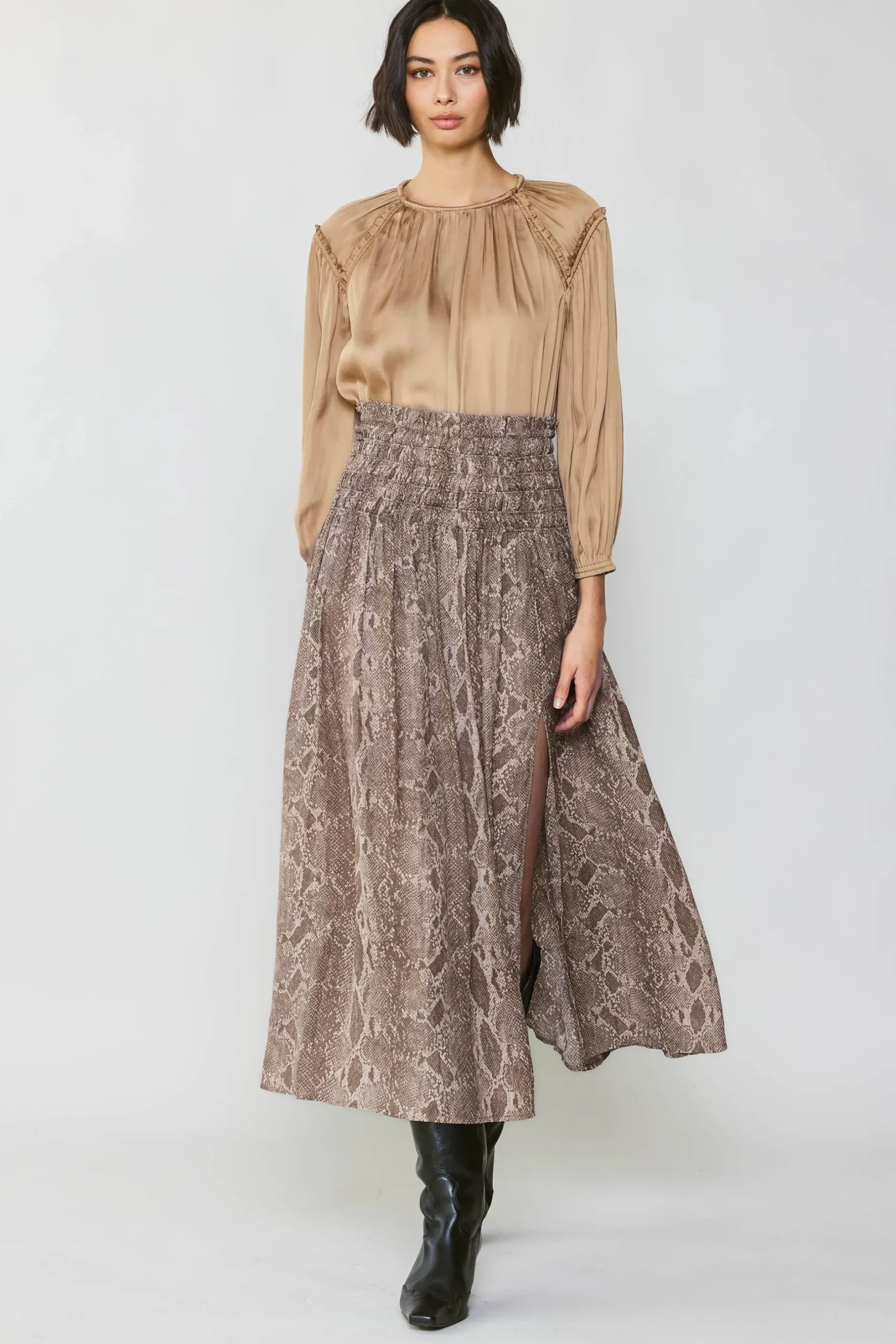This lightweight, flowy midi skirt features an hypnotizing snake print. You’ll love the ease and comfort of this skirt with airy side slits. It’s practically effortless, slipping right on with an elastic-cinched waist. Another plus: that softly crinkled texture of the fabric means it’s really low maintenance.