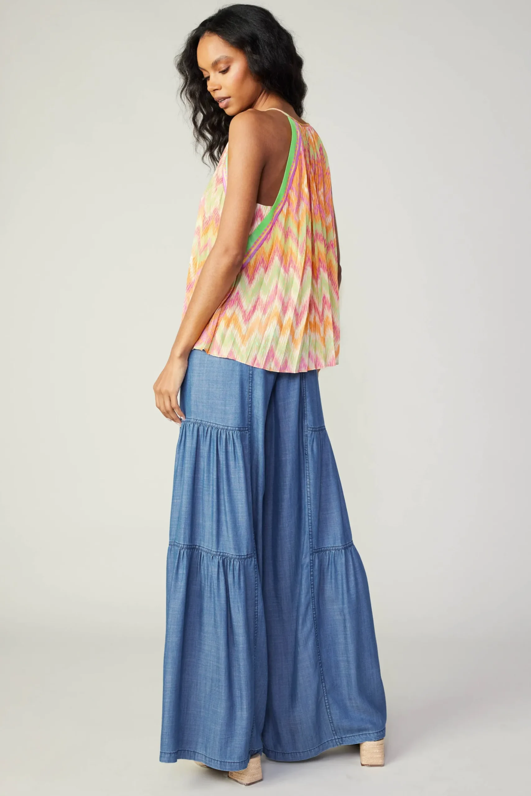 It’s all about that print. This halter top showcases a hazy chevron motif and striped trim in a palette of beachy colors. The split neckline ties at the front and has gentle gathers that enhance the relaxed, flowy shape.