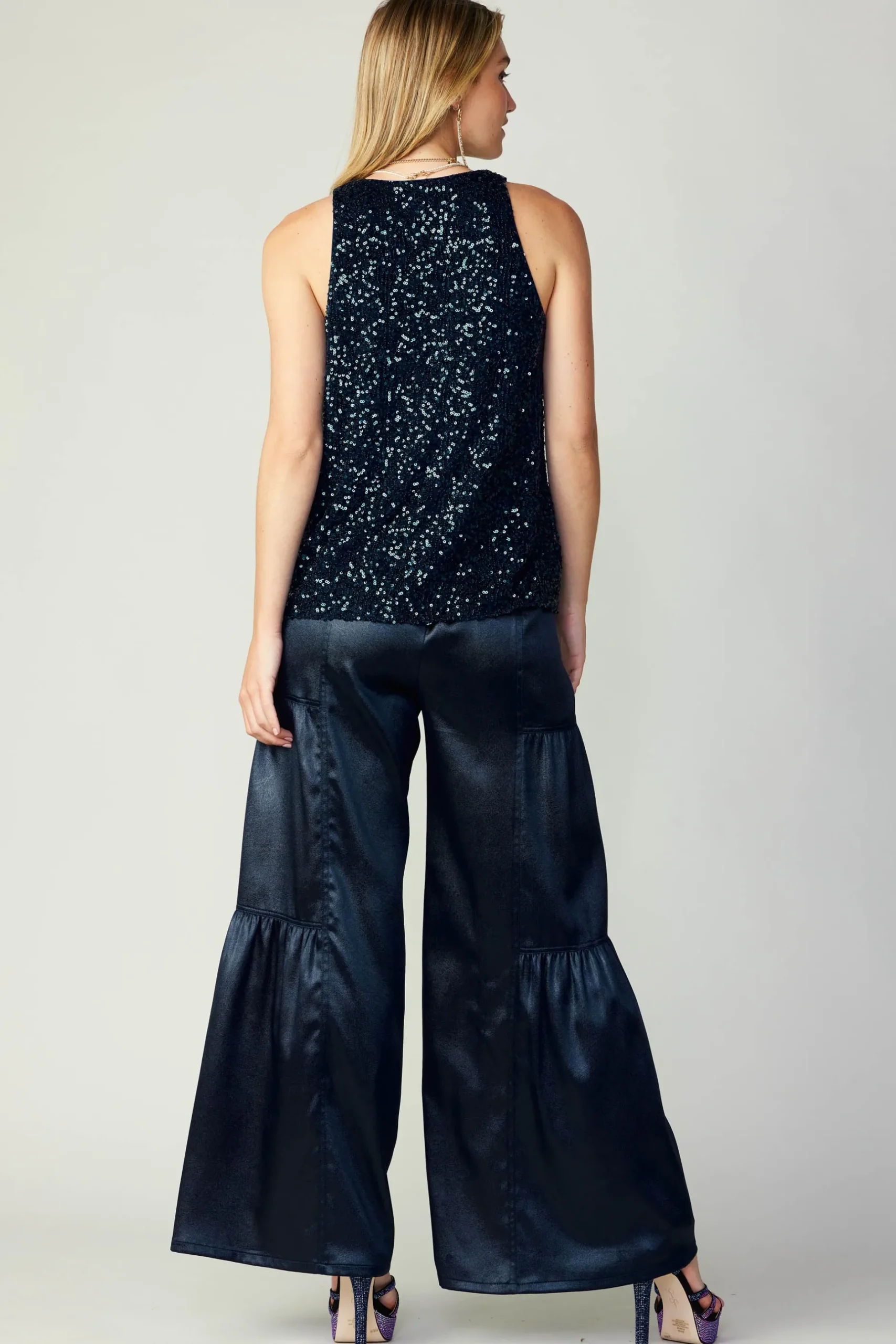 Covered in twinkling dark-blue sequins, this tank instantly transforms any look. Cut with a round neckline and a slightly relaxed fit, it’s got so much party potential.
