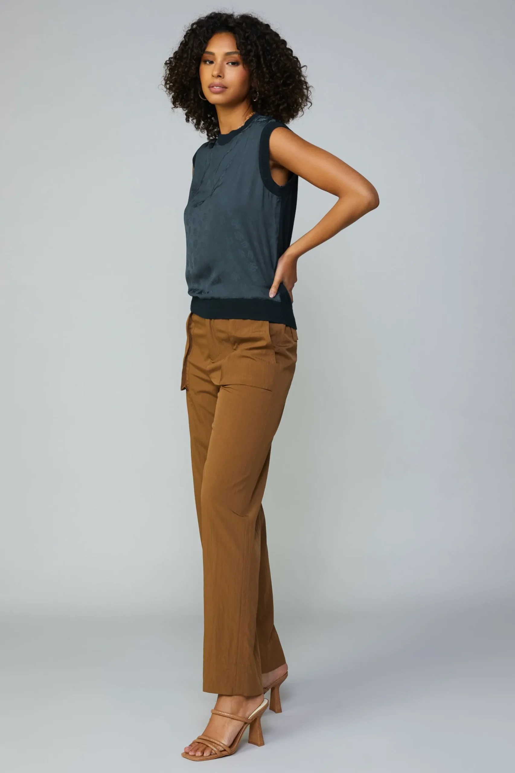 This knit top is perfect for warmer days with an airy, relaxed fit. It features a subtle jacquard front with contrast knit back. Designed in a sleeveless silhouette, it has a crew neckline and ribbed edges.