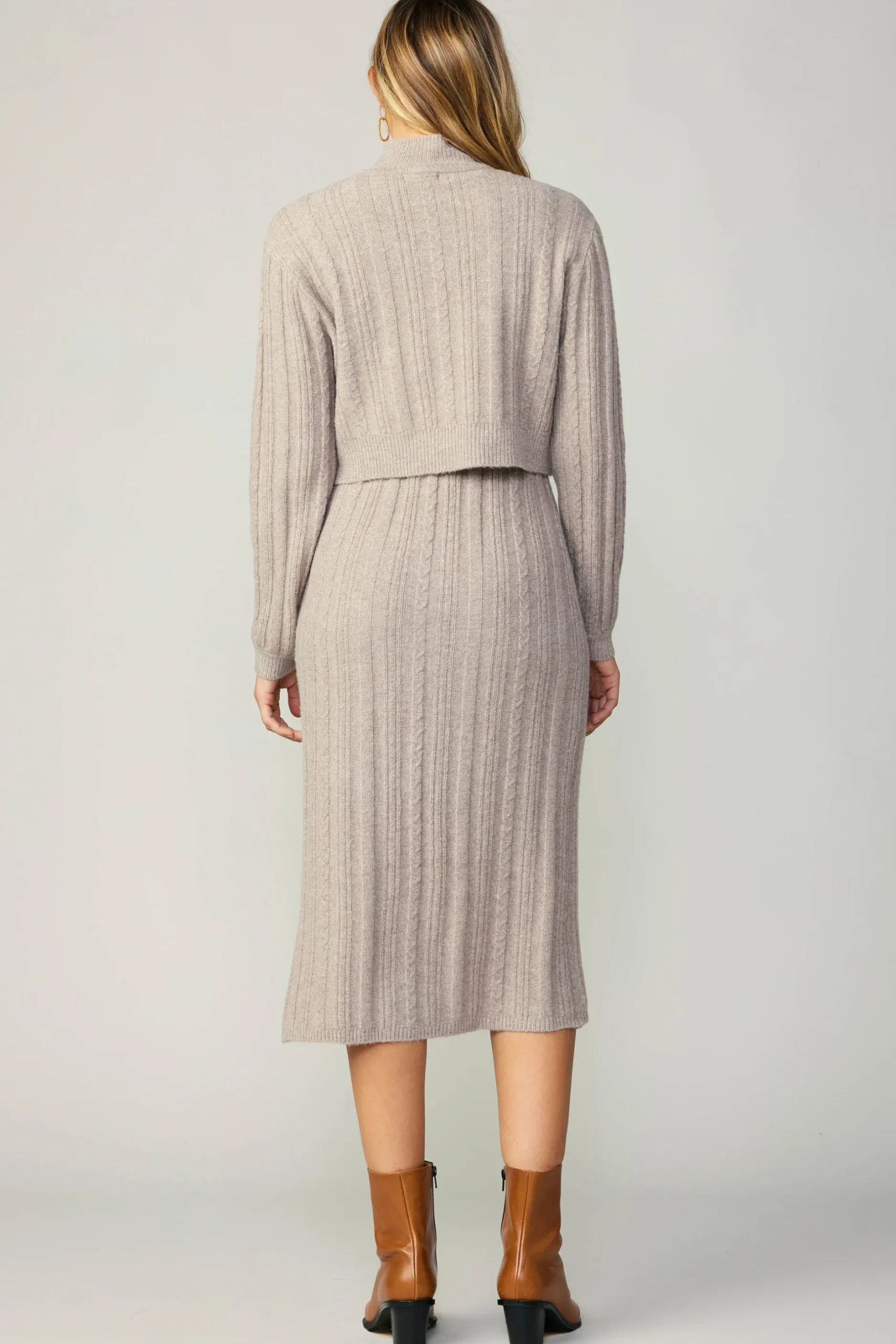 This cozy mock-neck sweater dress has a layered effect, designed with a fitted cable-knit dress underneath a matching overlay in a relaxed silhouette. It looks like a coordinating set, but it’s even more effortless as a single piece. Incredibly chic and easy to wear in a versatile beige shade.