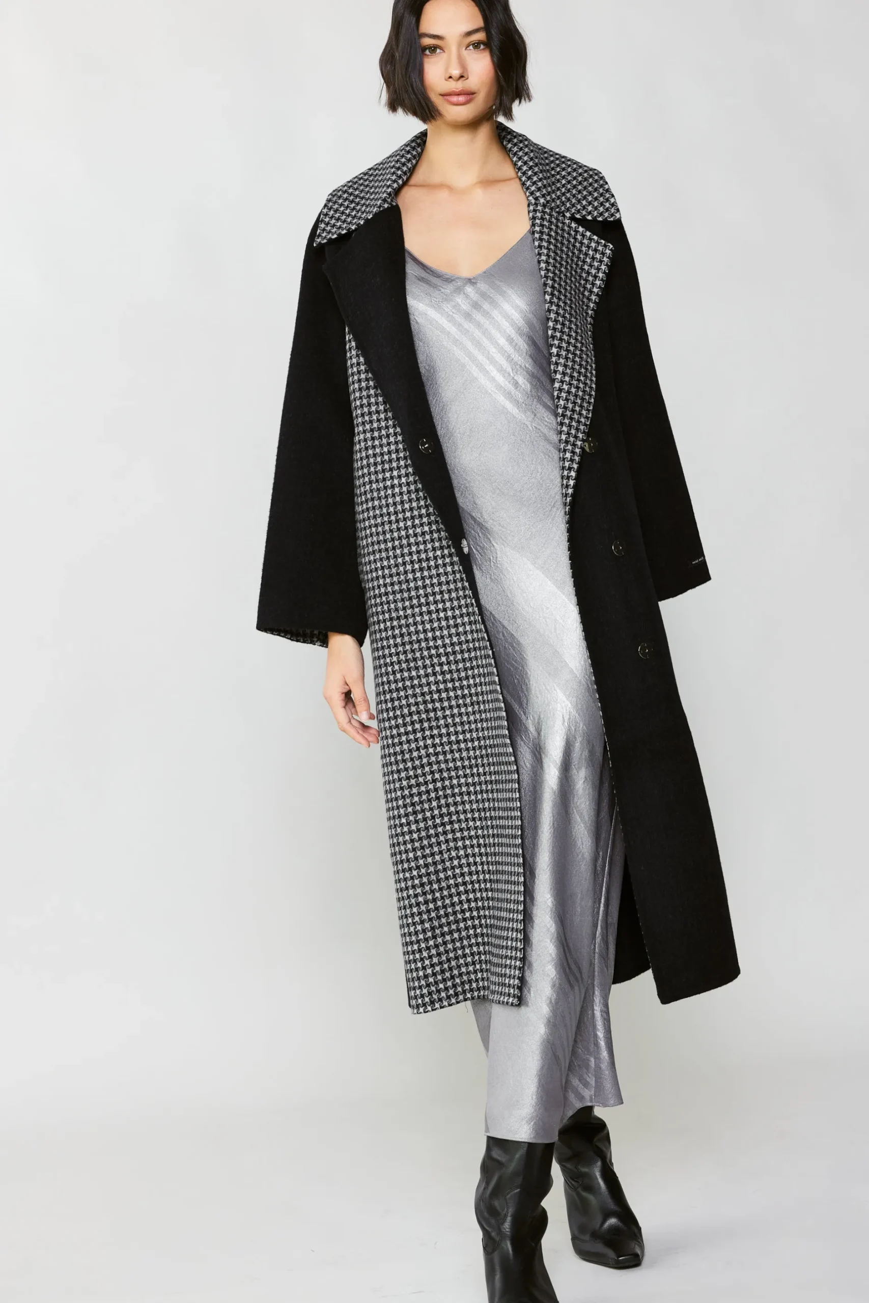 Houndstooth has never looked cooler. The classic check pattern contrasts with solid black on the colorblocked design of this tailored wool coat. Cut for an oversized silhouette with a longer length for extra warmth, the city-ready style is sure to be a favorite of the season.