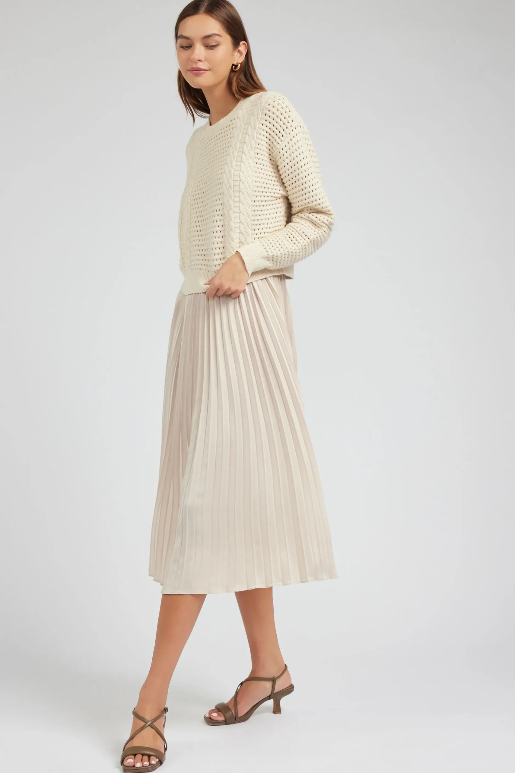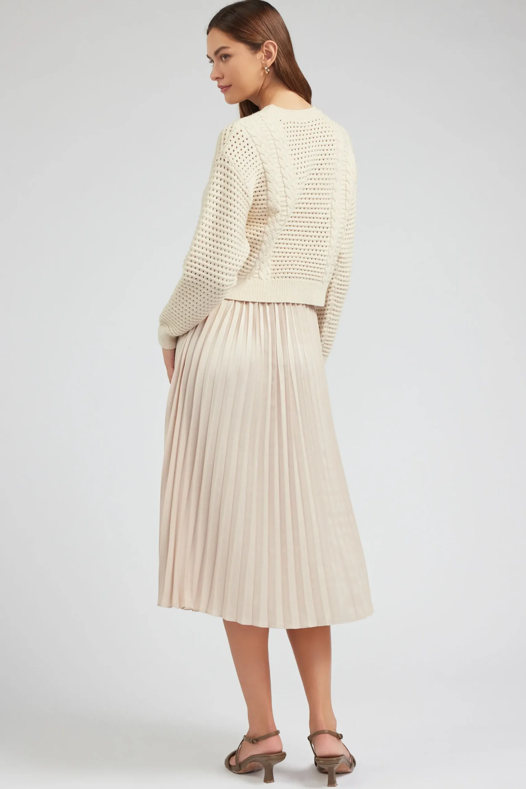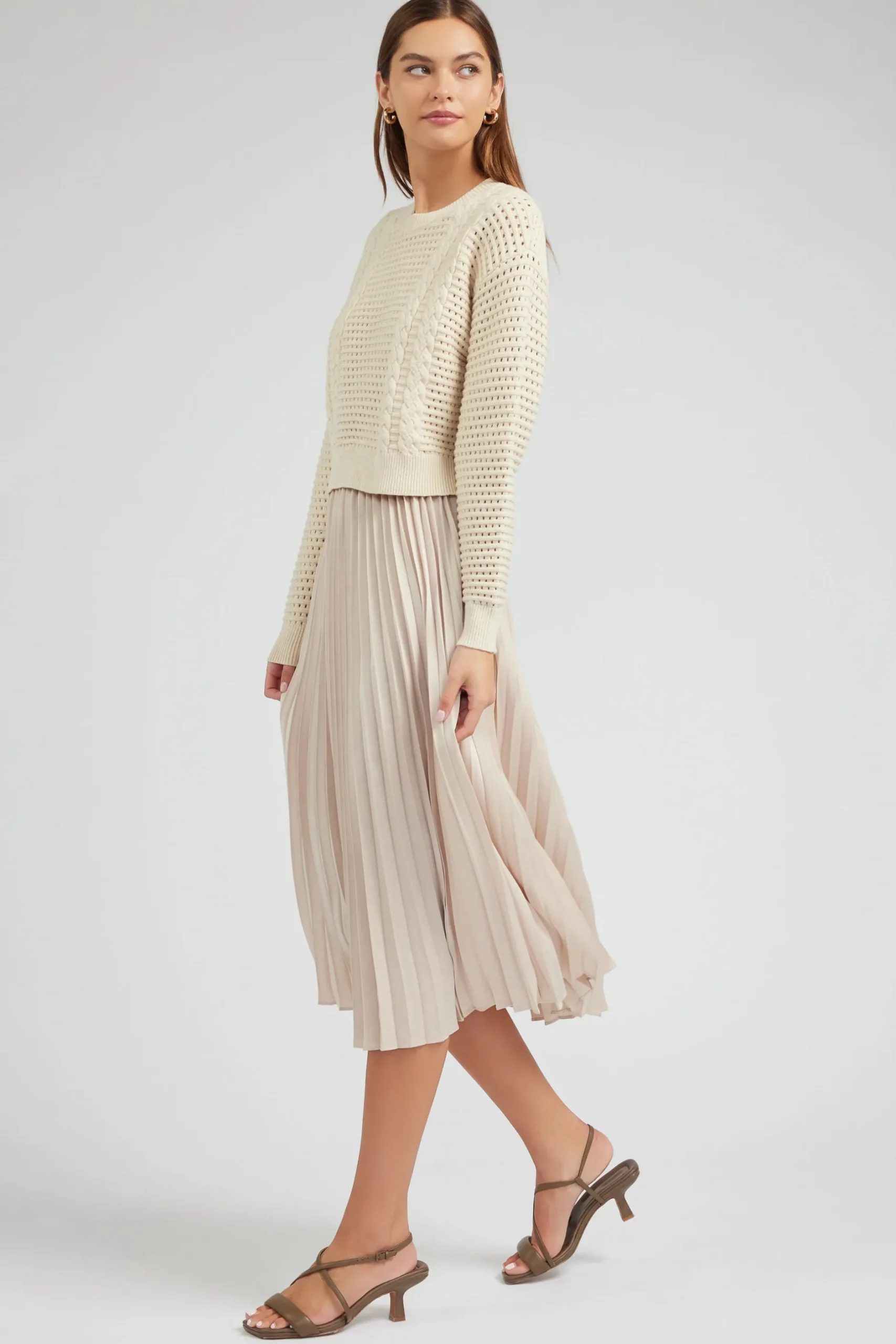 Set yourself ahead for the season with this neutral-hued look. The pleated dress and long-sleeve pullover sweater work together as an effortless pairing.