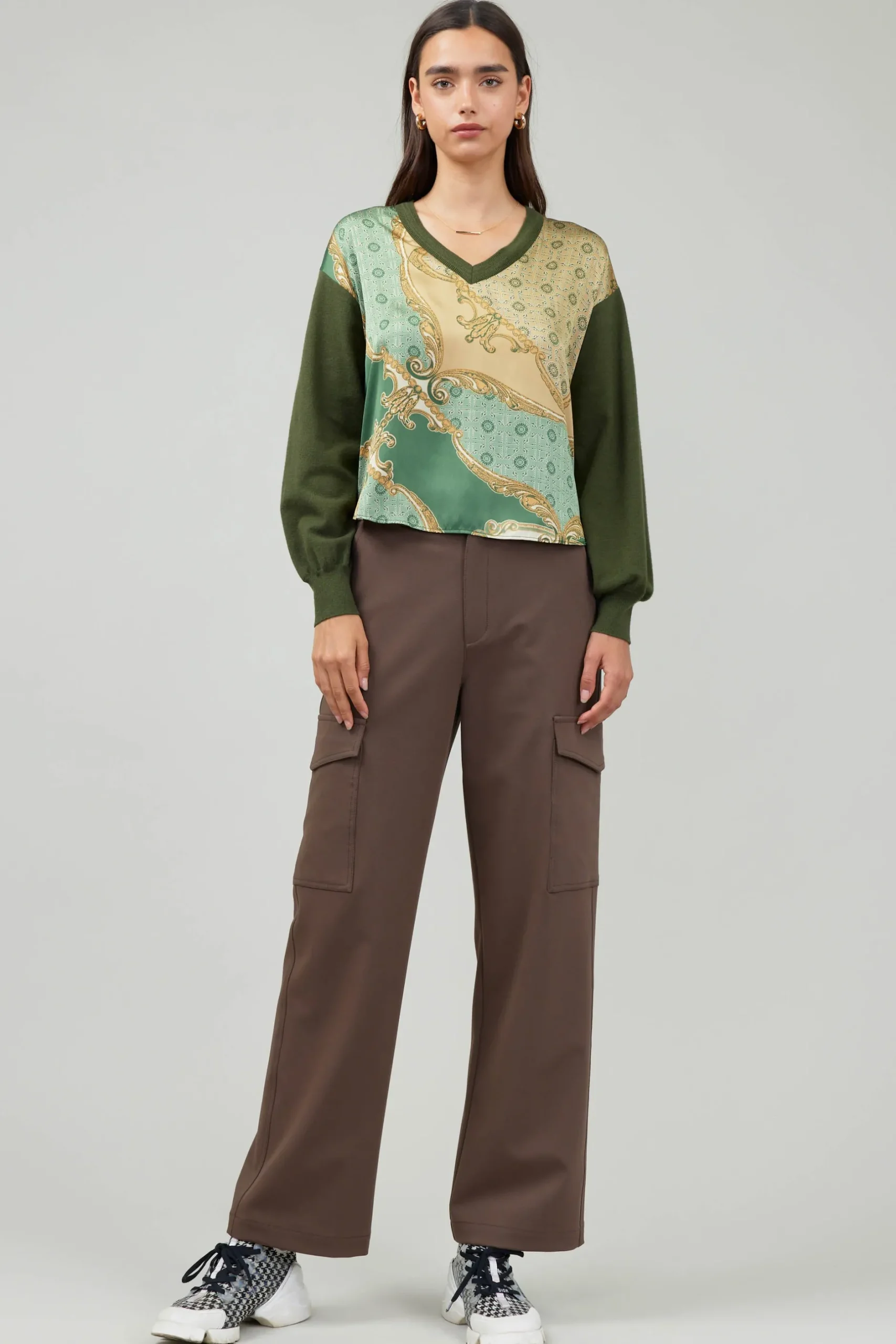 A tactile combination of materials comes together in an effortlessly put-together look. The cozy V-neck sweater contrasts against woven fabric, creating an enticing textural mix.