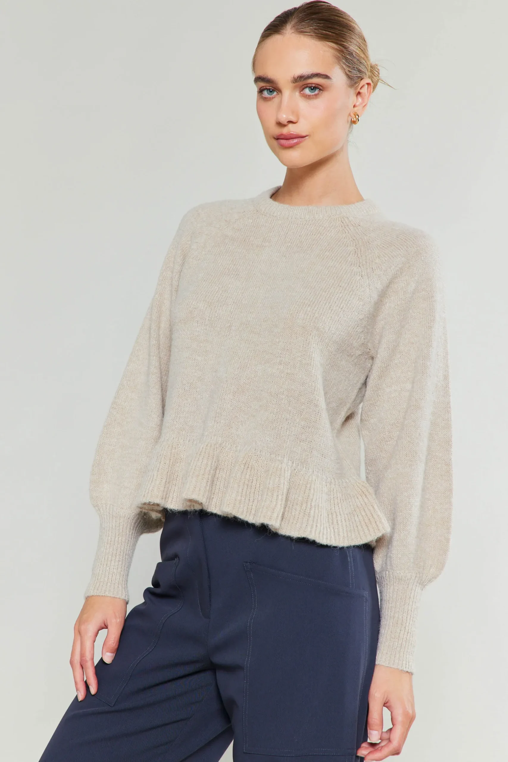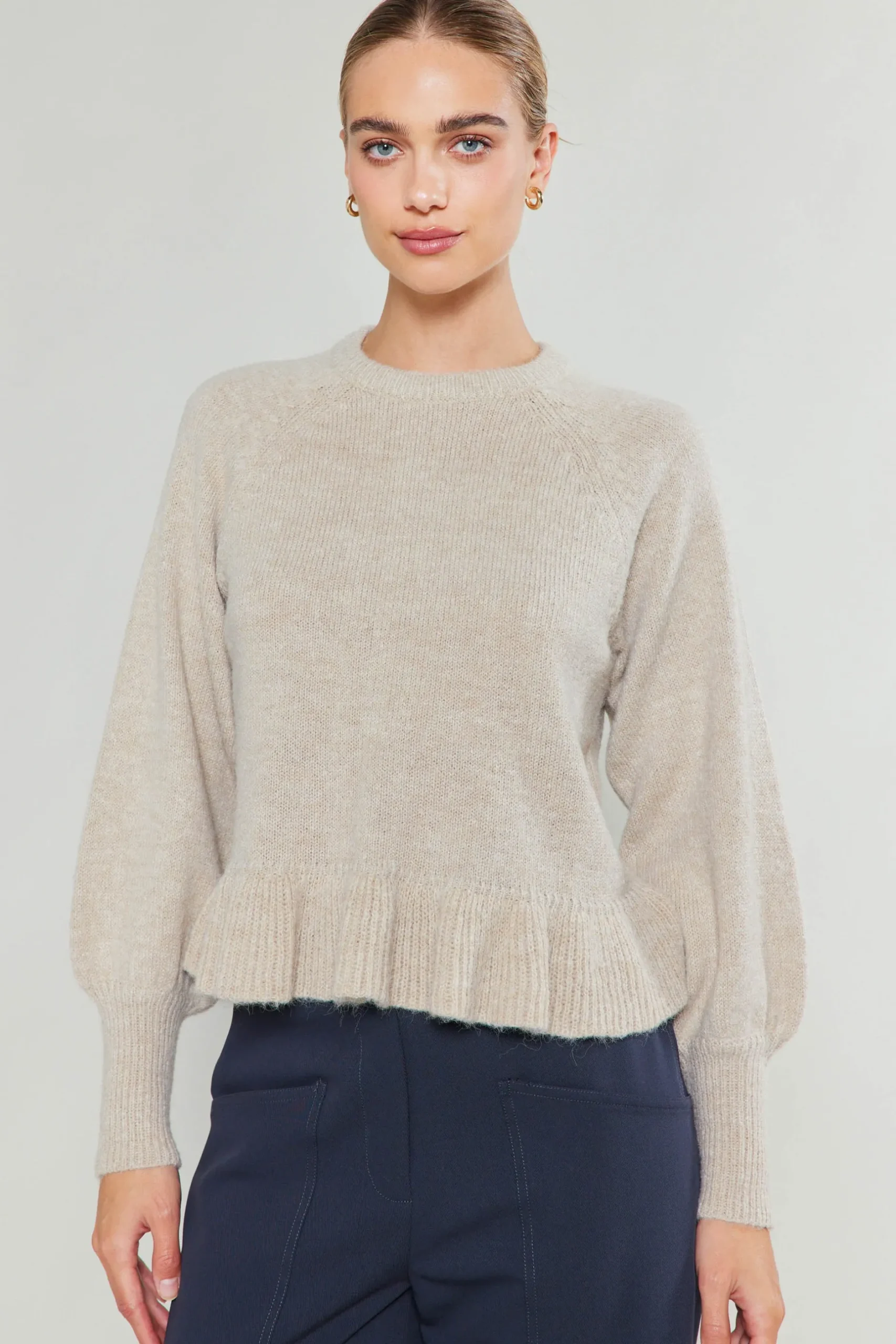 This round-neck sweater takes shape with balloon sleeves and a ruffled hem. Done in the perfect neutral shade, the slightly cropped number gives a feminine flourish to soft and cozy style.