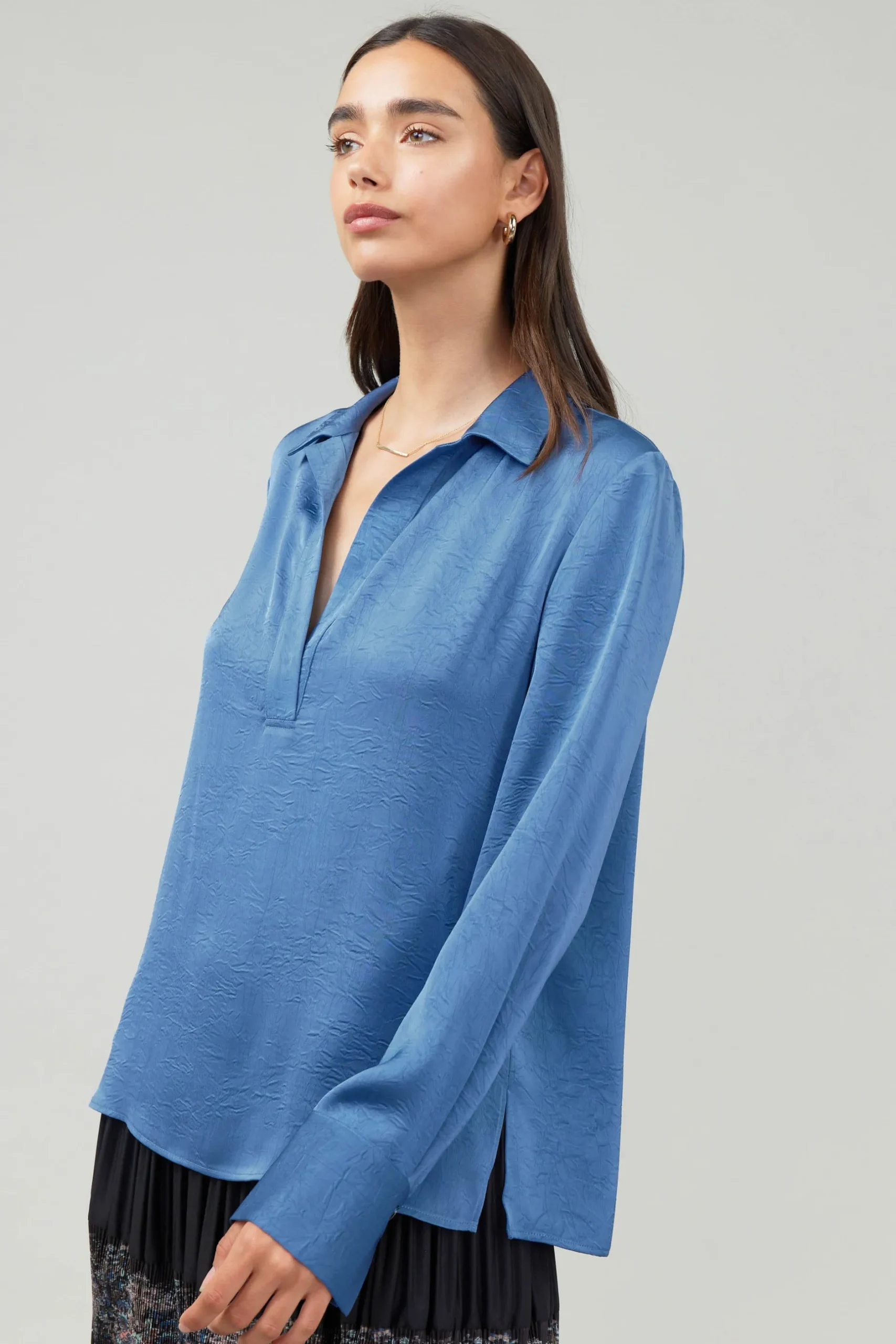 Lightweight this gently crinkled top makes any ensemble shine. The Johnny collar and side slits add a laid-back feel, so it can be dressed up or down with ease.