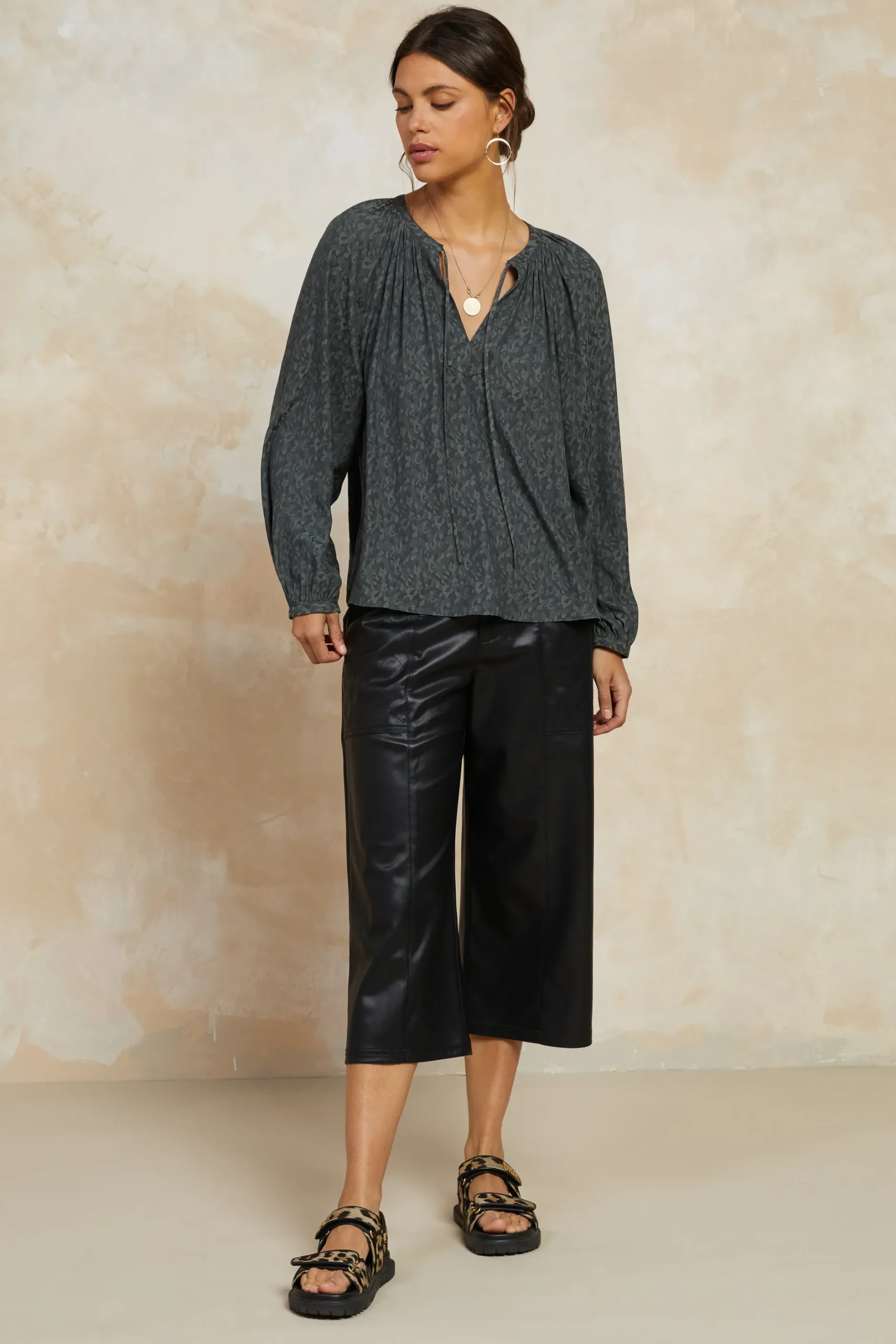 Elegance and ease come into perfect balance on this split-neck blouse. Gathered detailing enhances the fluid drape, and the tie detailing lets you adjust neckline to your liking.