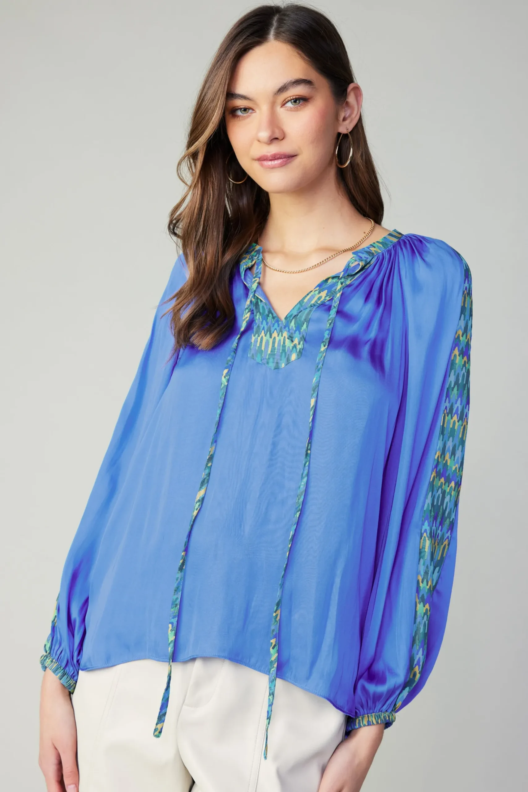 A dynamic mix of patterns makes this split-neck top a work of art. geometric elements create a collage effect, on the sleeves for a unique look.