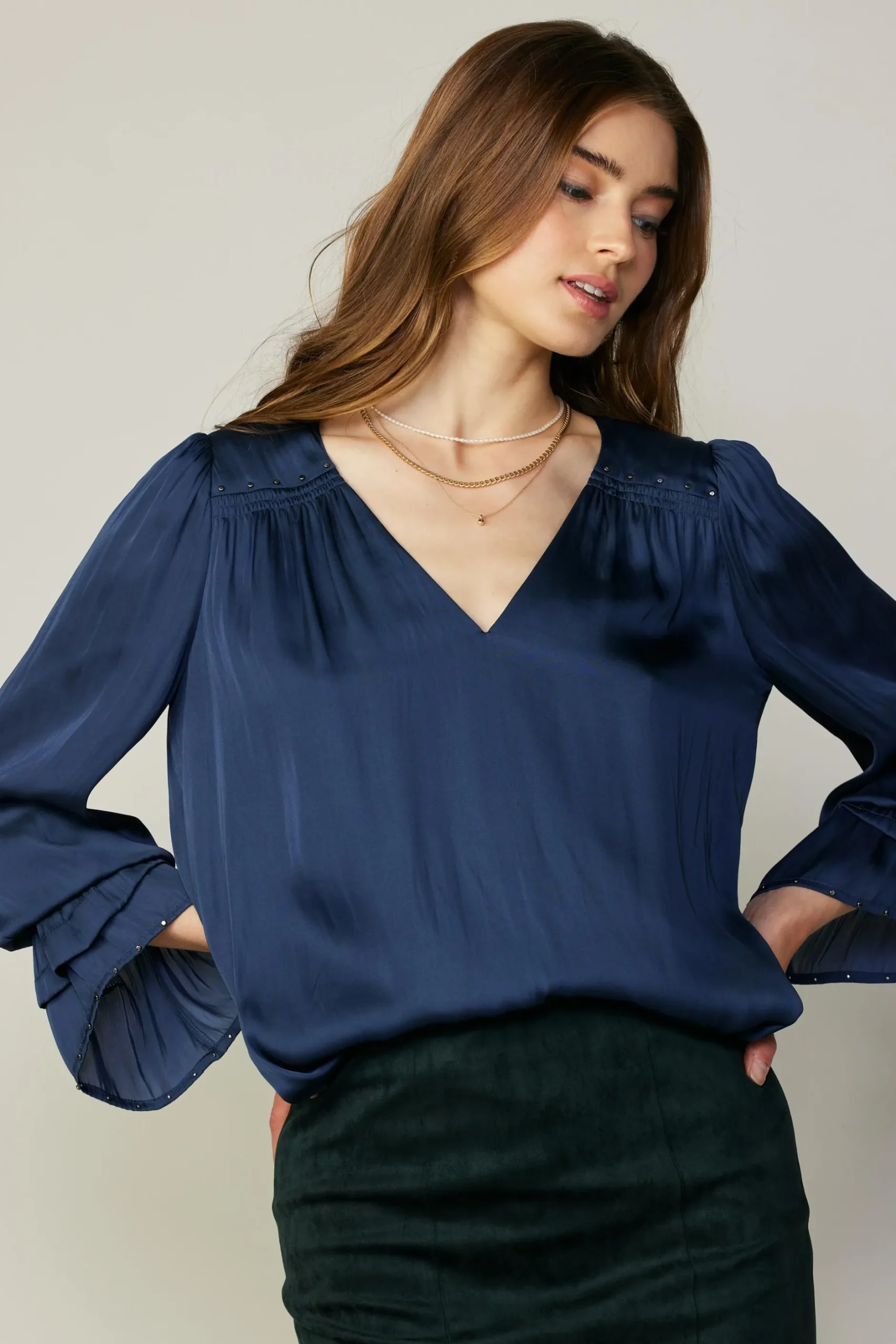 Cascading layered cuffs amp up the drama of this breezy V-neck top, while tiny studs add some edge. A touch of smocking at the yoke finishes the look.