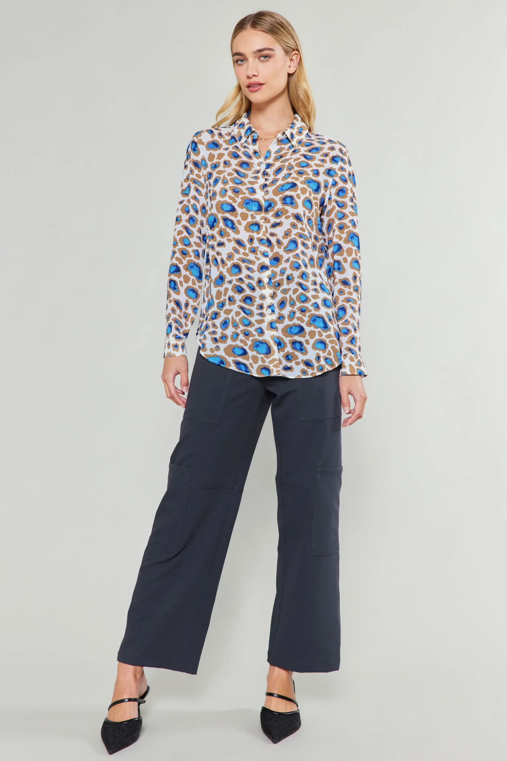 A long-sleeve buttondown shirt goes natural in a fresh take on a cenote print, blue sinkholes that dot the yucatan peninsula – It’s a statement that’s impossible to miss.