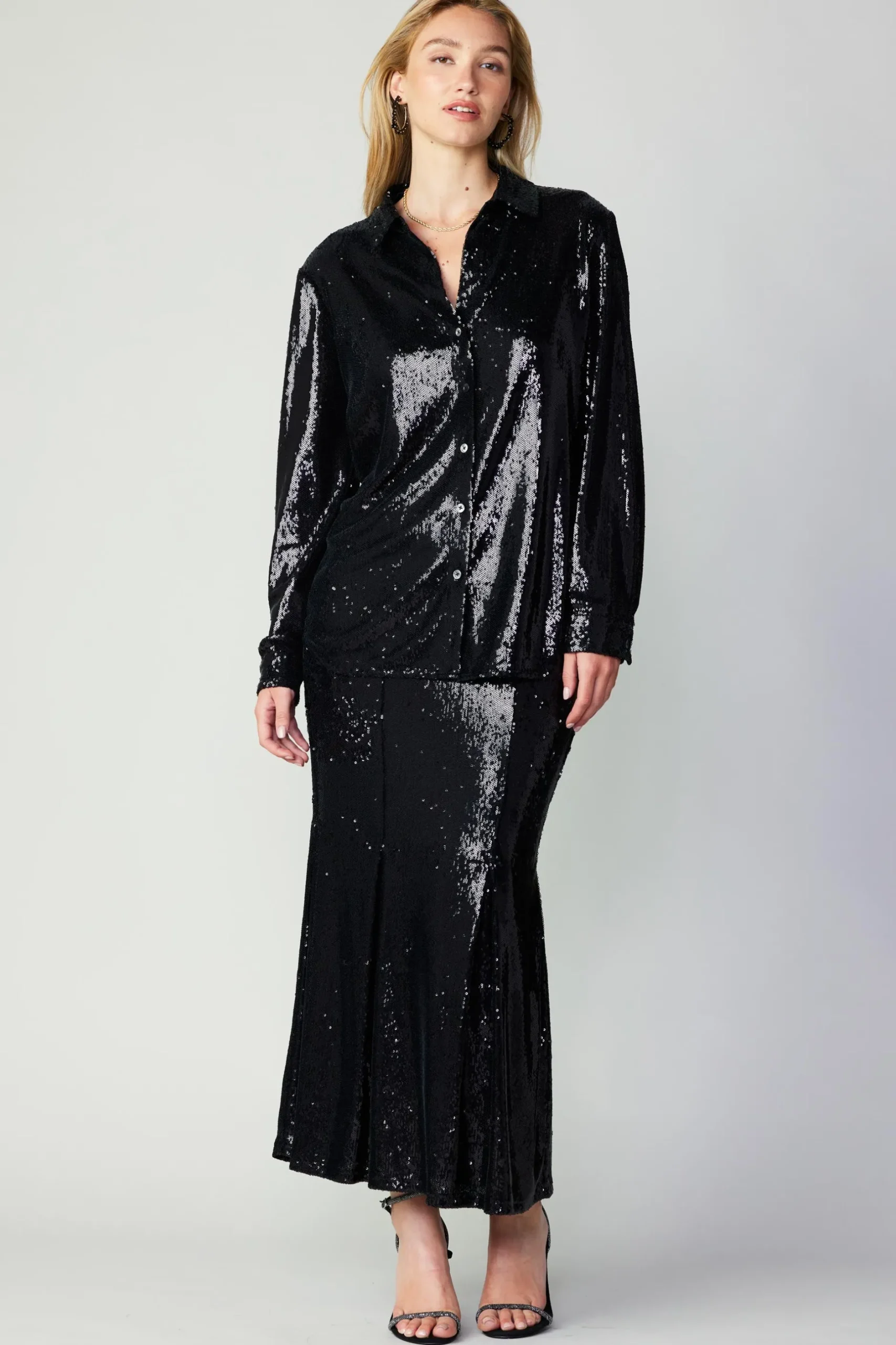 Shimmering black sequins transform the classic button-up shirt into a statement piece that catches the light at every angle. Tuck it into a pair of jeans or dress it up with something tailored.