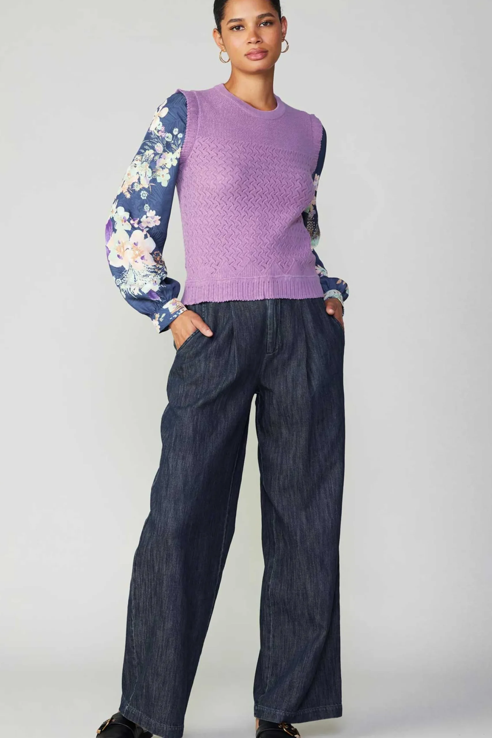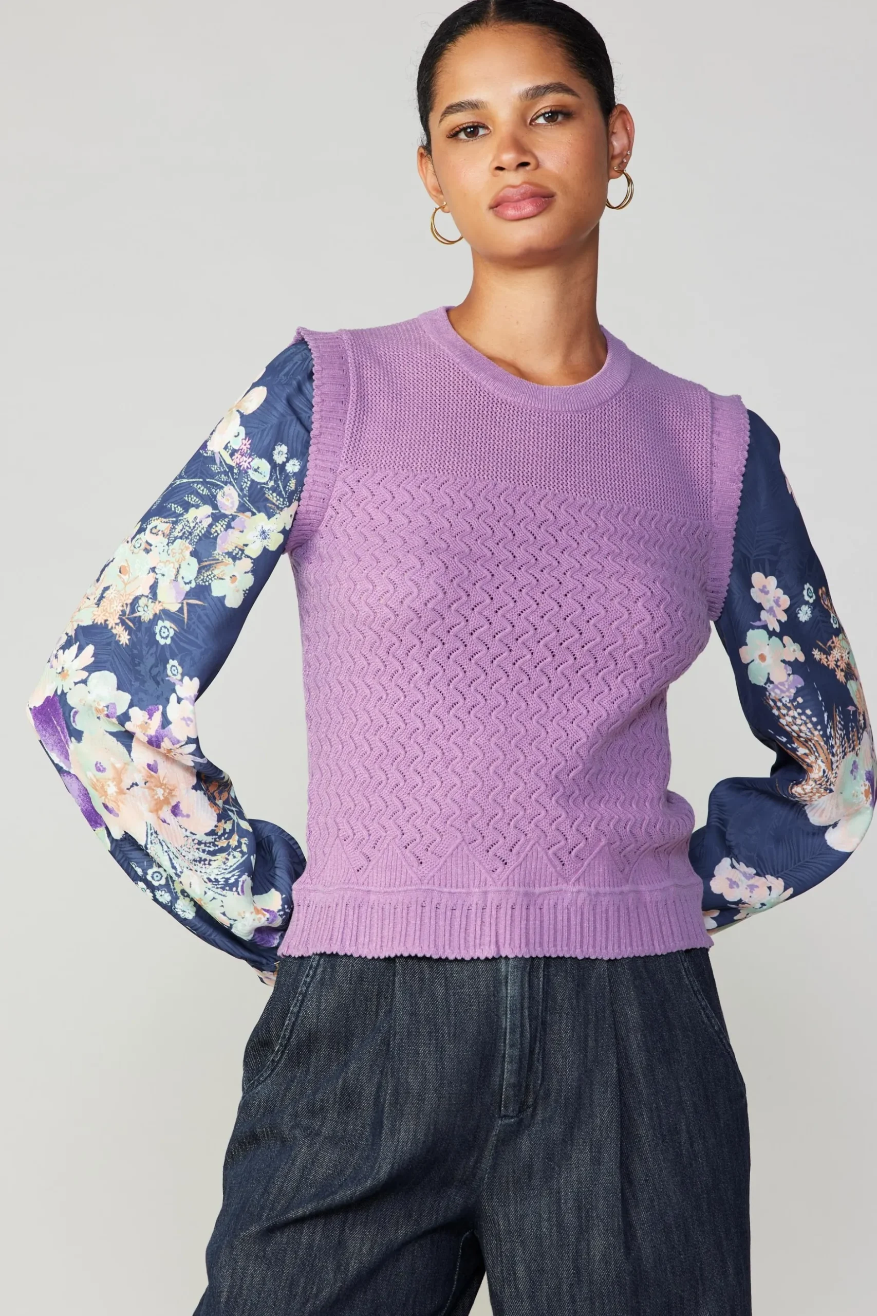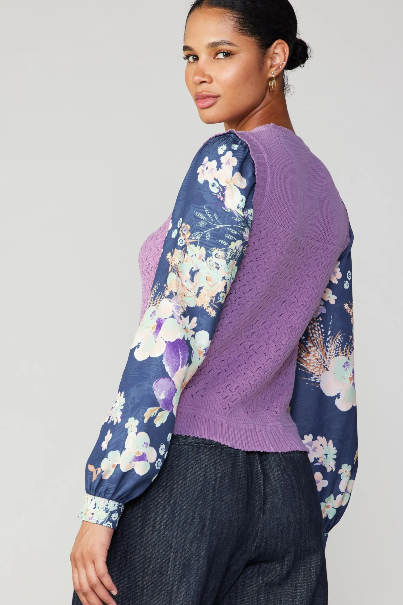 With its contrasting fabrics, this sweater is far from basic. A comfortable space-dye knit makes up the bodice. Navy-blue jacquard sleeves add volume and movement
