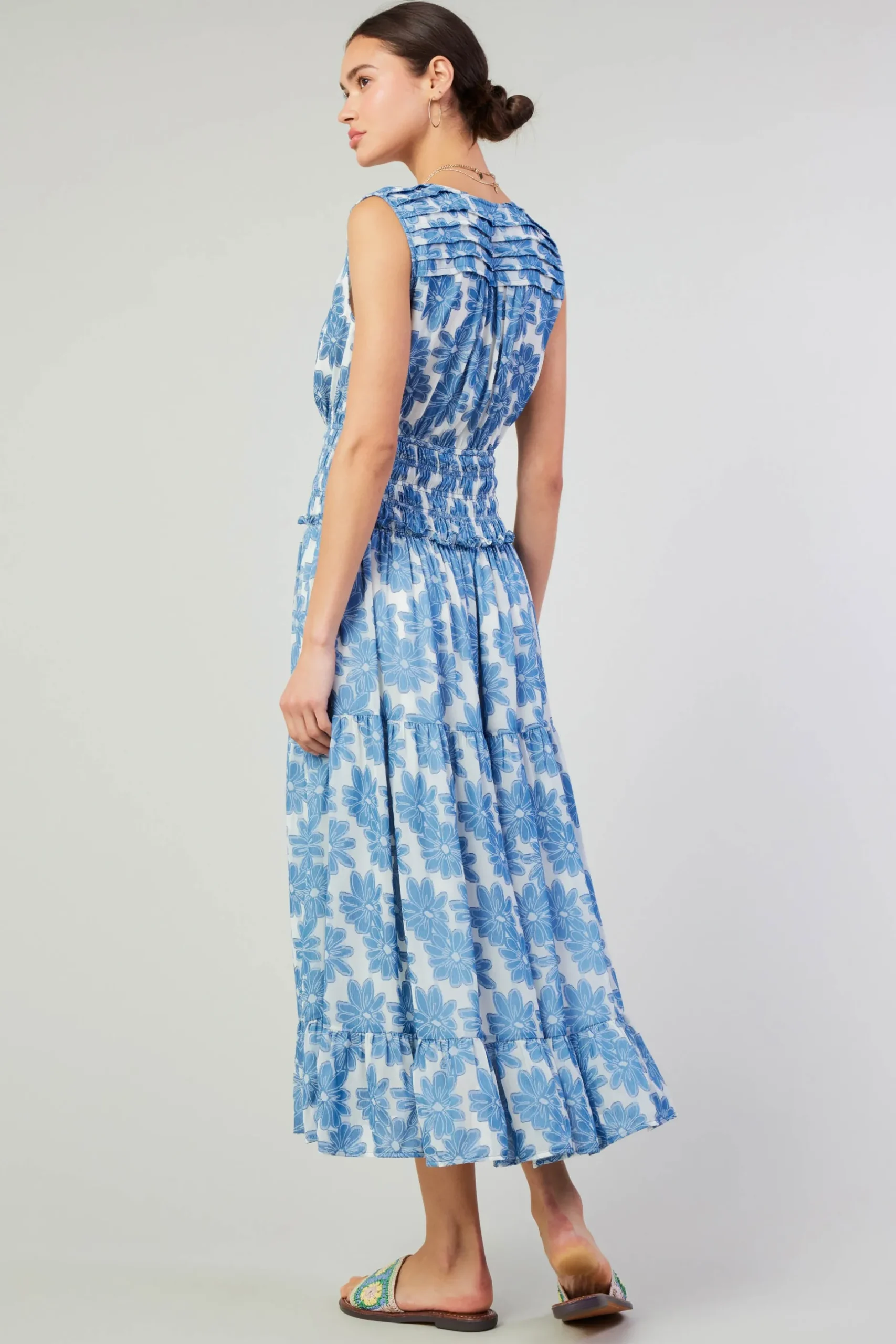 Take off with a new look for the season by slipping into this tiered midi dress. Printed with an abstract nature motif, it has a surplice-style bodice with fold detailing at the shoulders, comfortable smocking to draw in the waist, and a shin-skimming tiered skirt.