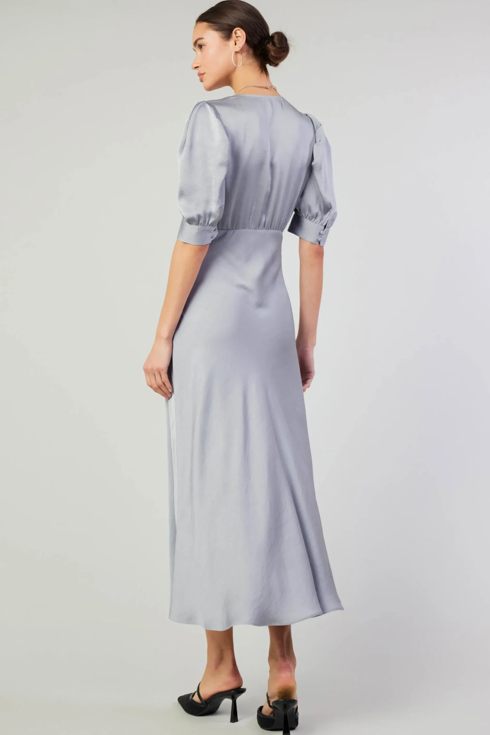 Sophisticated and feminine, this silvered-colored dress exudes elegance. A gently gathered bodice and puffed short sleeves deliver structure to the otherwise simple V-neck silhouette.