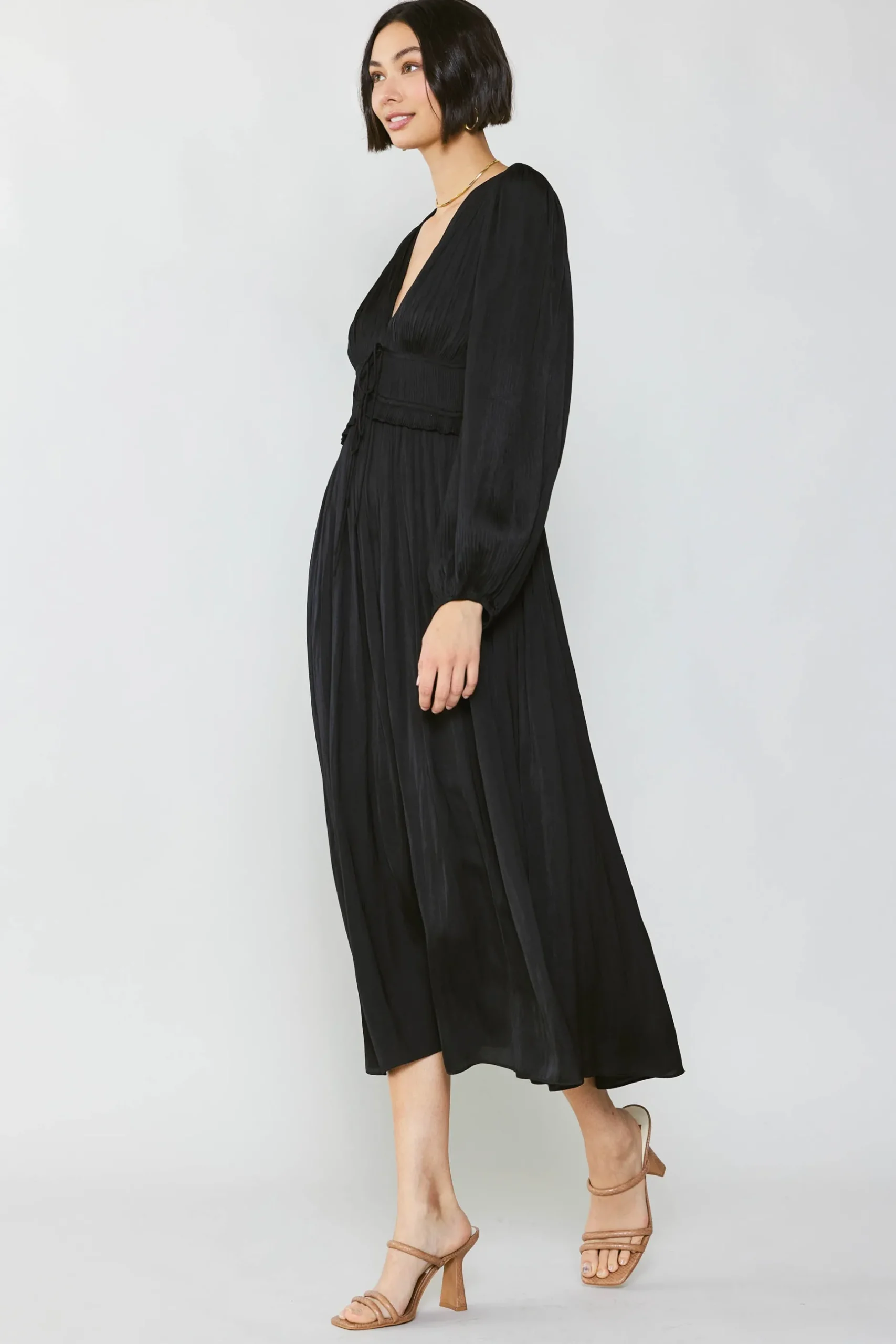 An ethereal long-sleeve dress fit for a modern goddess. With a plunging neckline and delicate pleated top that ties at the center, it’s truly a stunner.