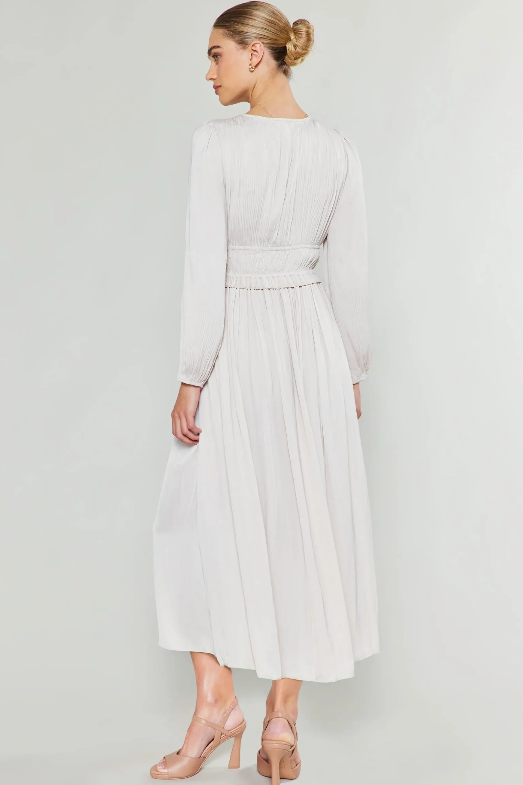 An ethereal long-sleeve dress fit for a modern goddess. With a plunging neckline and delicate pleated top that ties at the center, it’s truly a stunner.