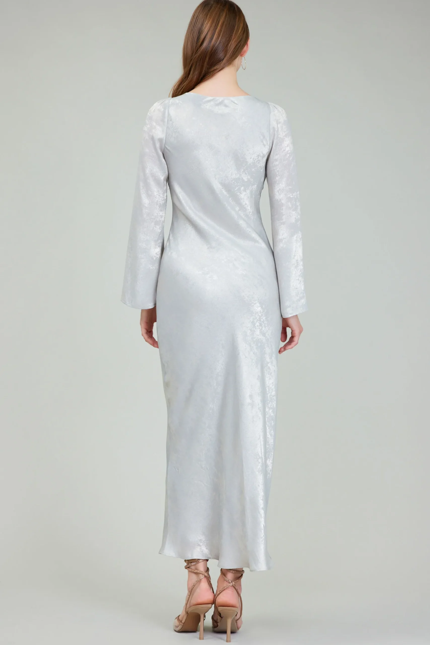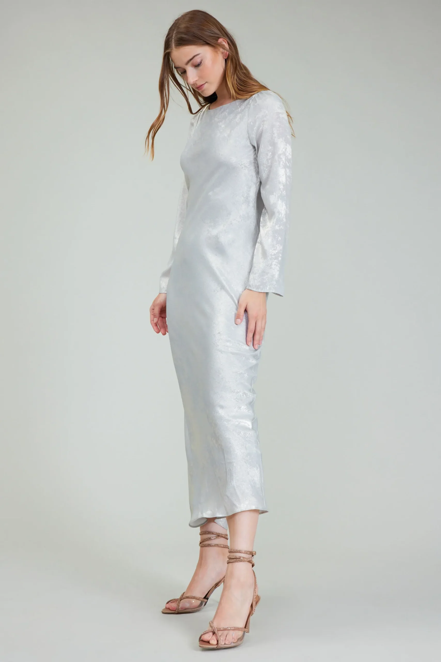 Simple yet incredibly chic, this lustrous dress has a graceful boat neckline and long sleeves with gathered shoulders. It has a shimmery sheen and flattering in a body-skimming silhouette that lands at the shins. Metallic threading woven throughout adds a touch of luxury.