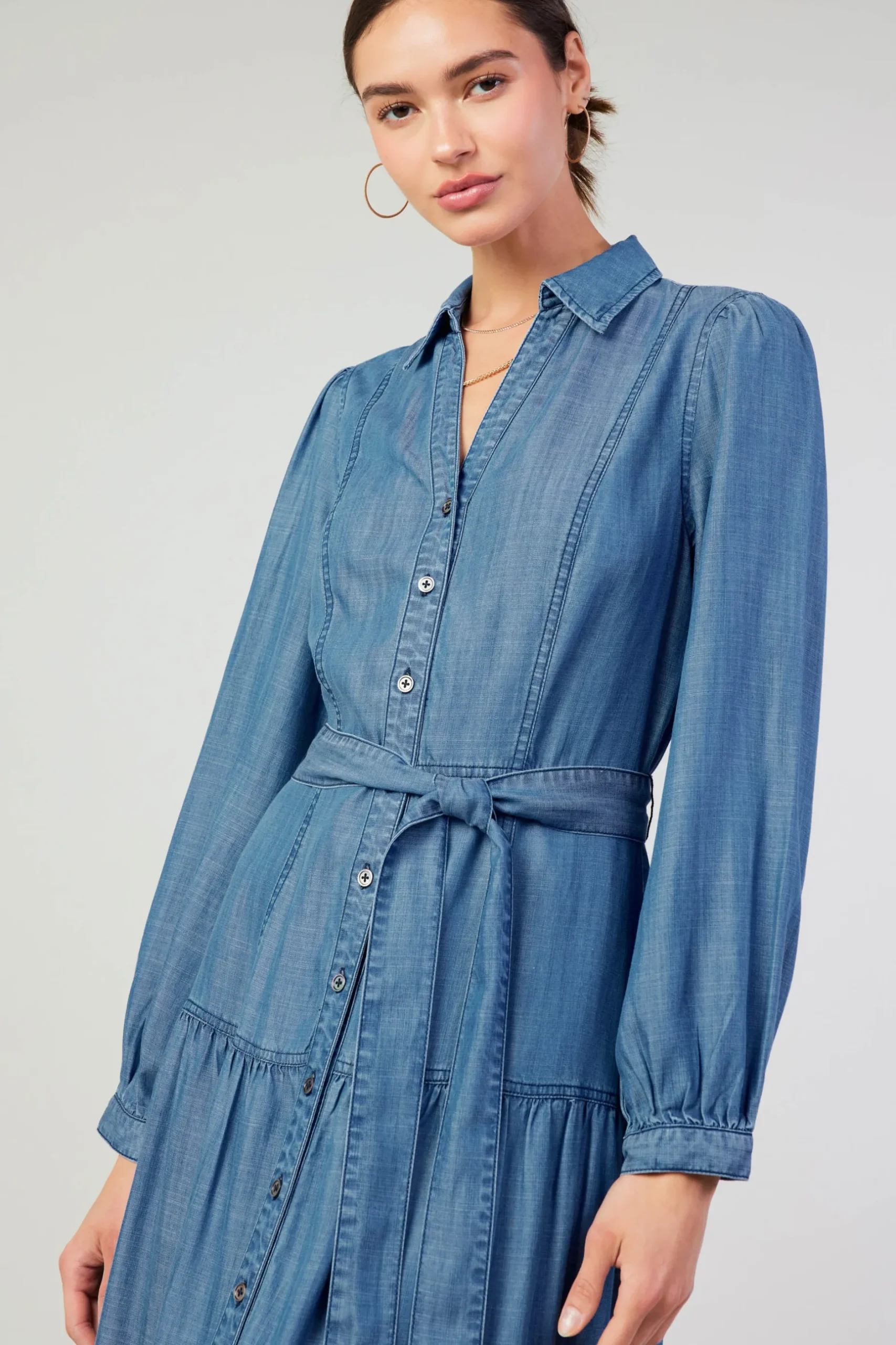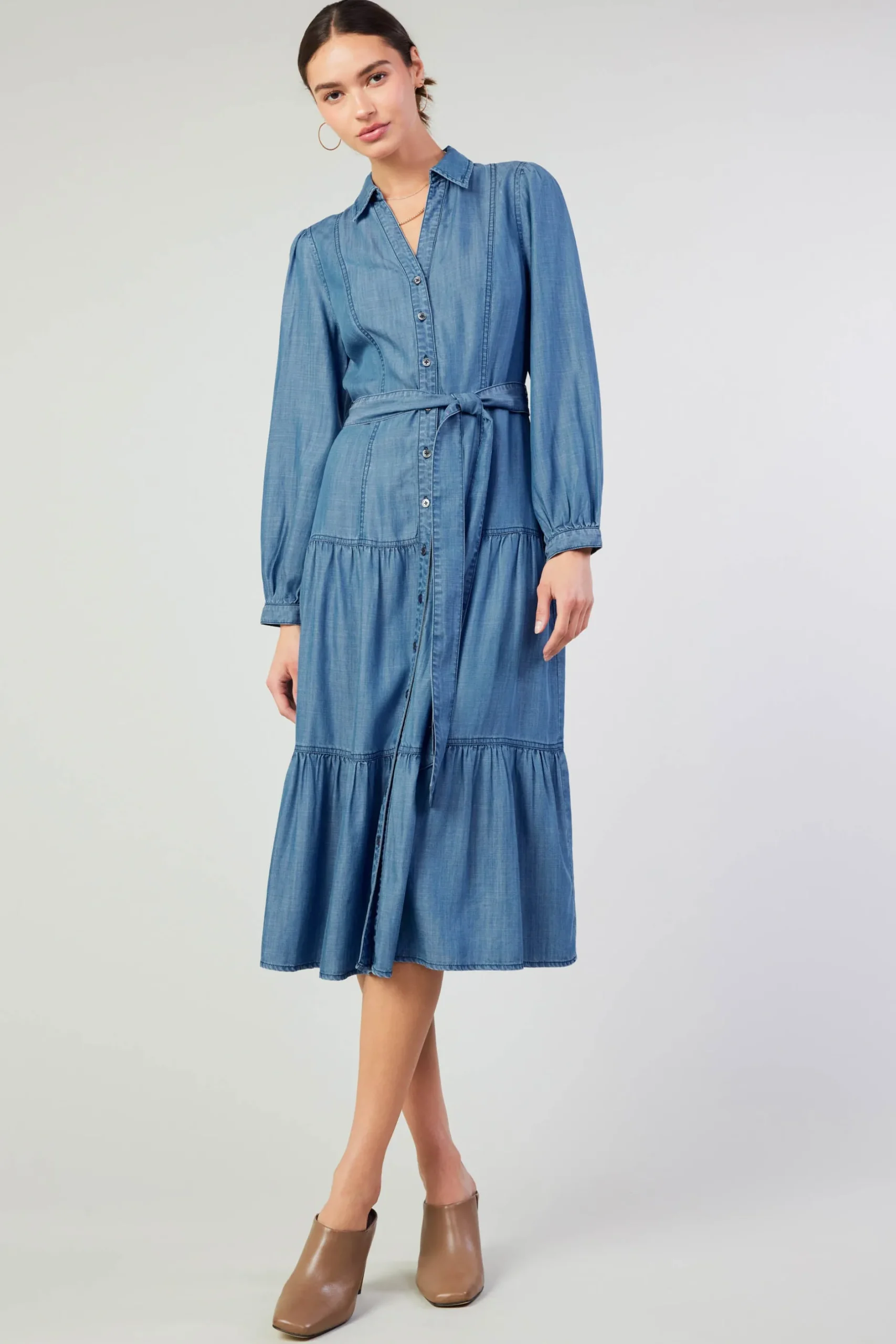 This long-sleeved dress will take you from the beach to city block without missing a beat. The shin-grazing style has a loose, straight fit and features a split neckline, buttons down the front, and tiers on the skirt. Accented by soft gathers, it’s finished with a self-tie belt to draw in the shape just the way you want.