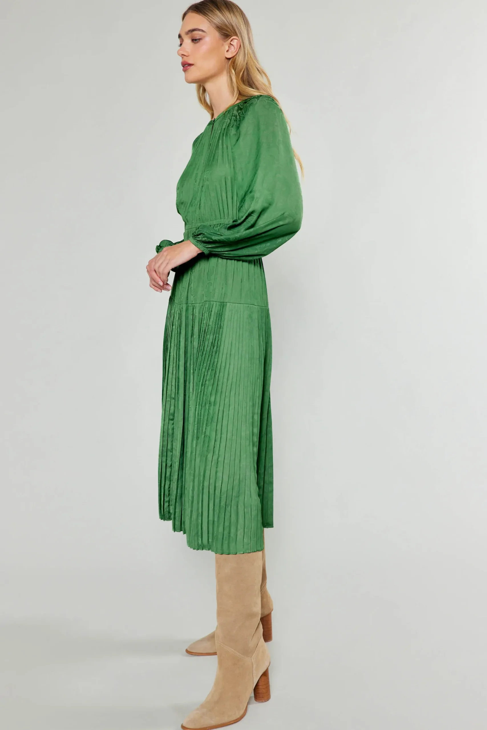 Soft gathers and sharp pleats harmonize together on this long-sleeve dress in lush green decorated by a swirling paisley pattern. Featuring a round neckline with a button closure and front keyhole, this striking number moves effortlessly with every step.
