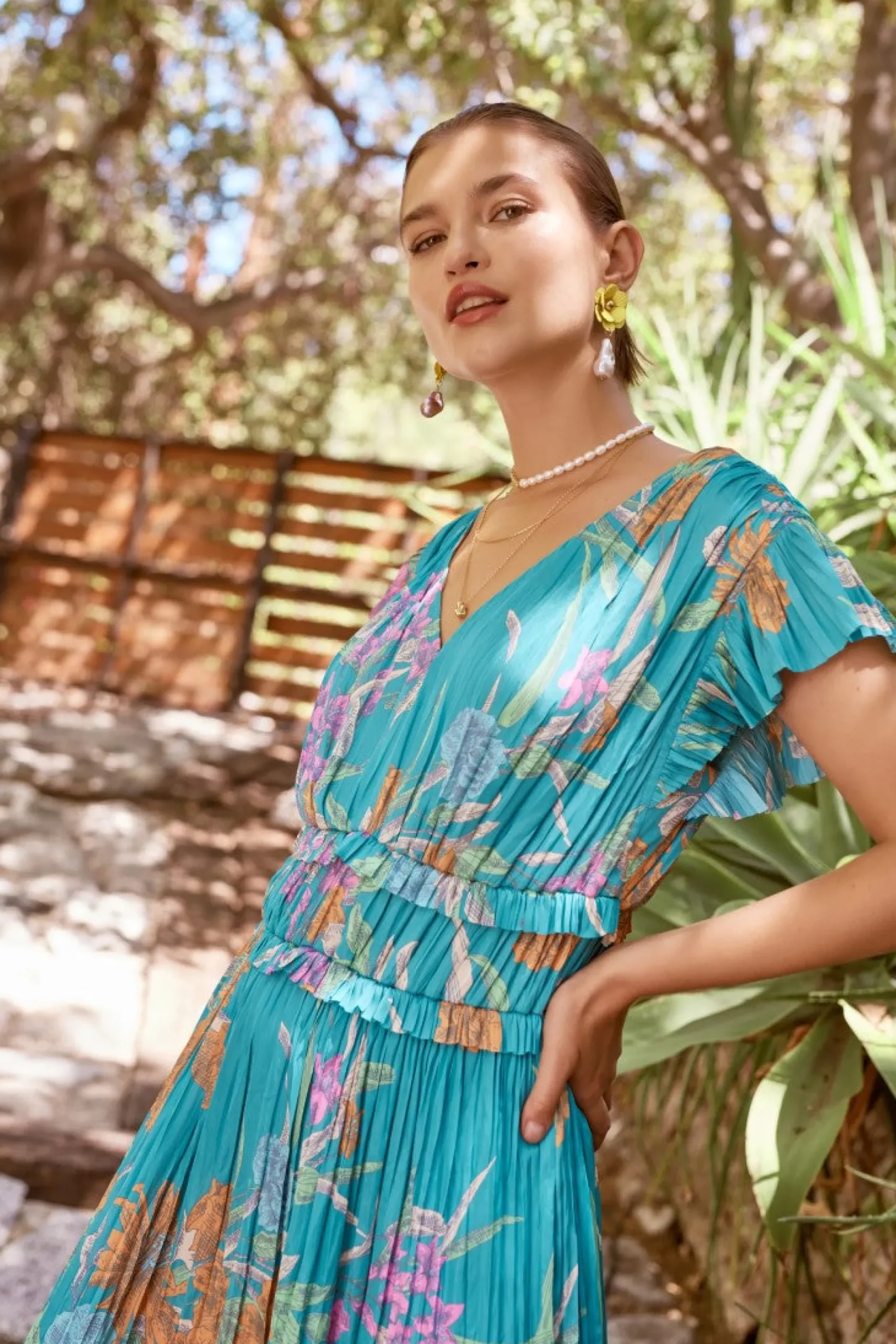 This floral-print midi dress has a bright, botanical look in a palette of punchy colors. It’s designed in a shin-skimming tiered silhouette with a V-shape neckline, pleated cap sleeves, and ruffle accents.